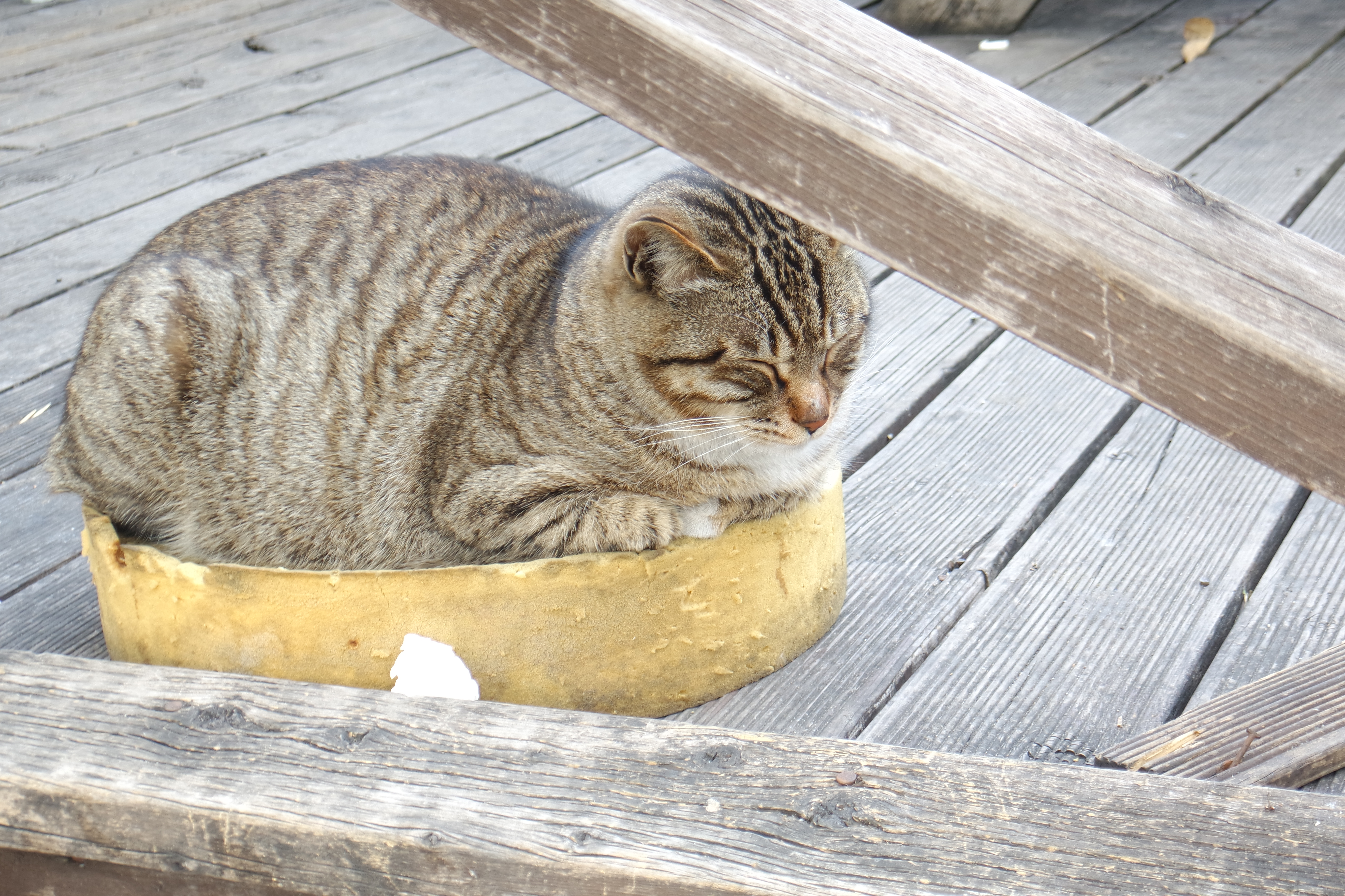이 고양이는 항상 노란 통(원반)에 앉아 있습니다. 특히 잘 때요.