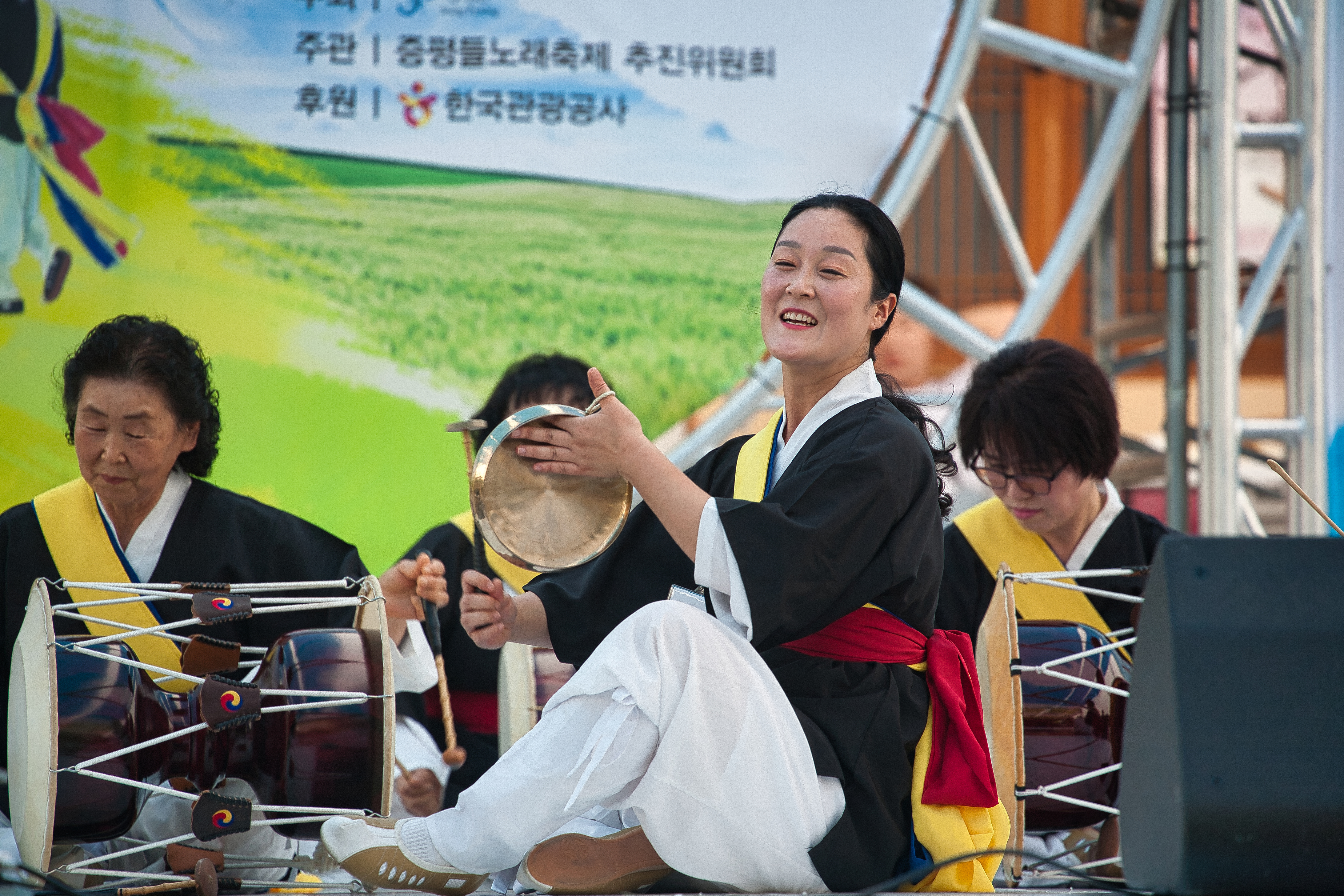 꽹과리를 연주하면서 즐거운 마냥 웃음을 자아내고 있다.