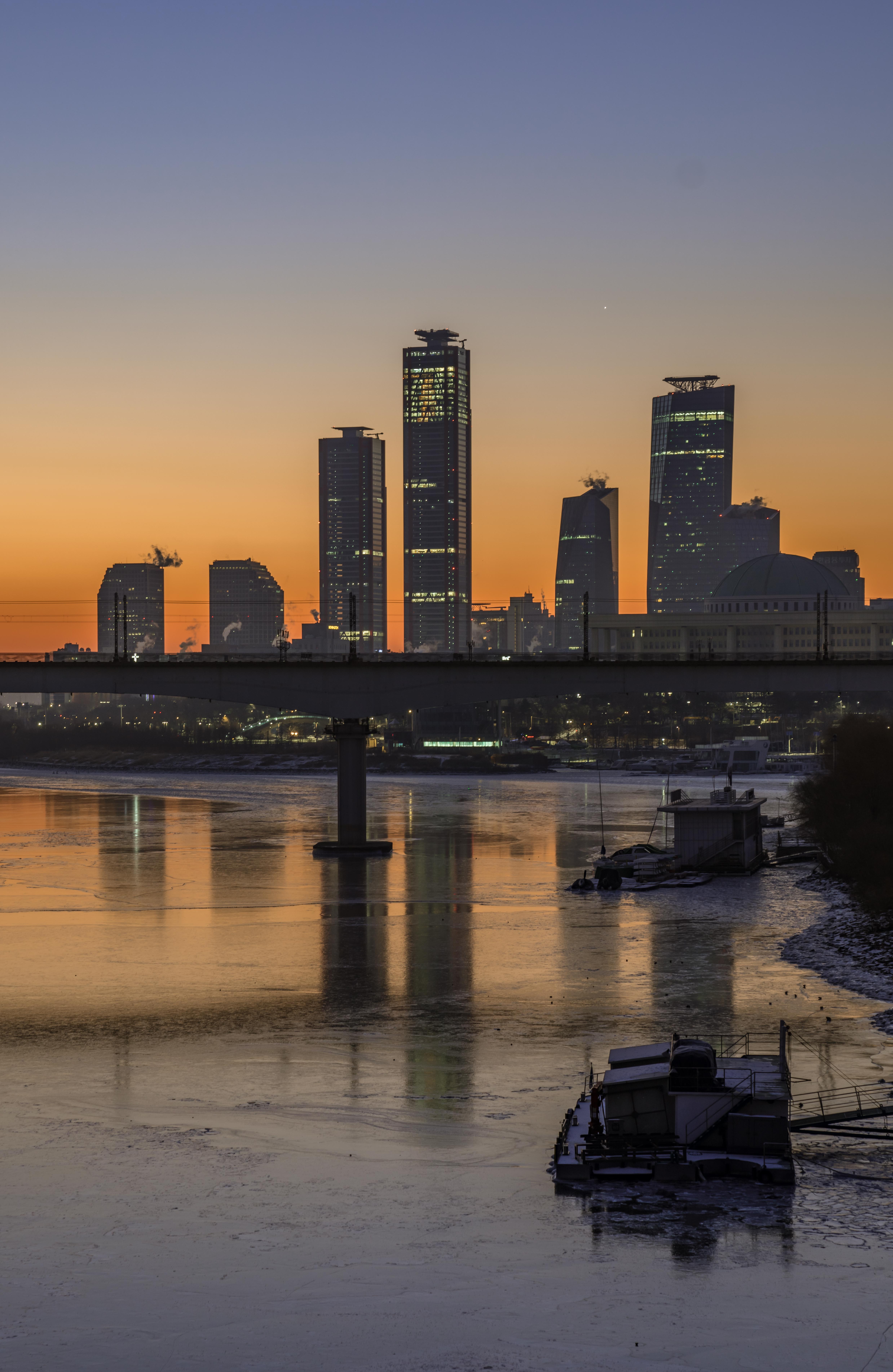 아직 다 떠오르지않은 태양이 여의도의 스카이라인을 붉게 빛내고 있습니다. 다양한 건물들이 여명빛을 받아서 더욱 인상적입니다. 한강에 반영된 건물들이 아름다운 풍경을 더해주는 사진입니다.