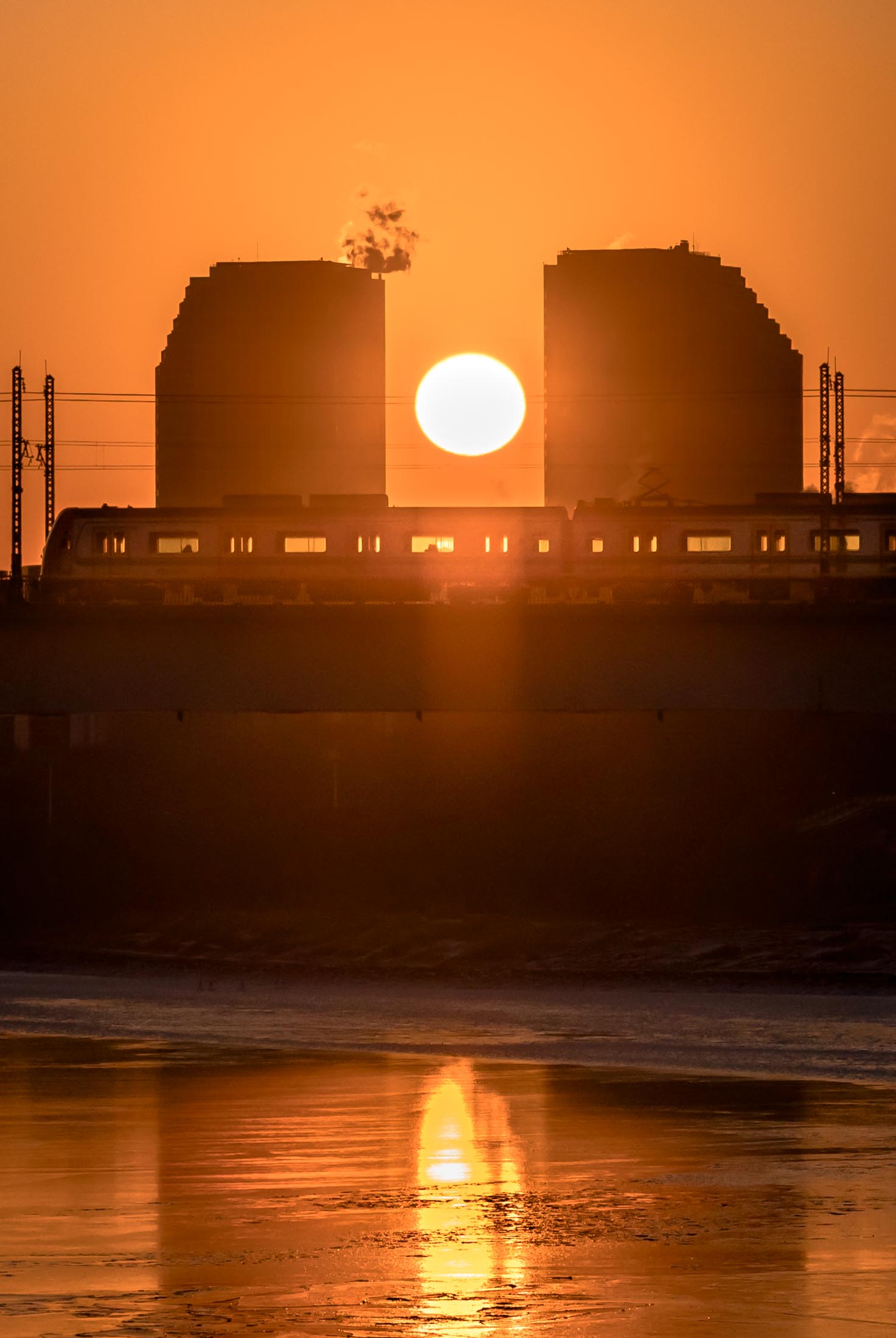쌍둥이 빌딩 사이로 떠오르는 아침 해가 지하철에 빛을 비추는 모습이 정말 인상적입니다. 아직 사람이 많지않은 지하철에는 황금빛의 태양빛을 받으며 하루를 시작하는 사람들의 모습이 담겨있습니다.