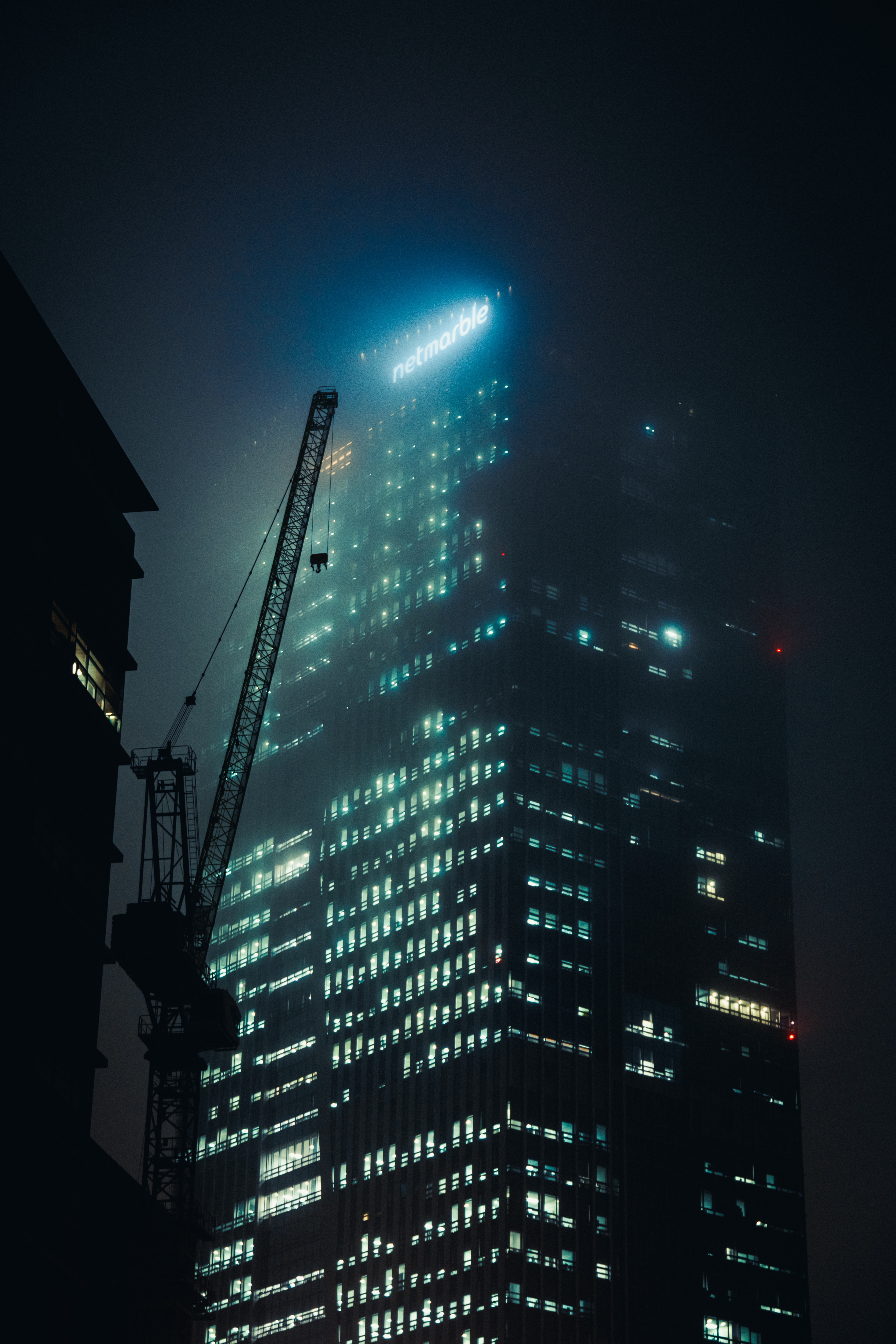 겨울같지 않은 날씨속 안개에 둘러싸인 건물.