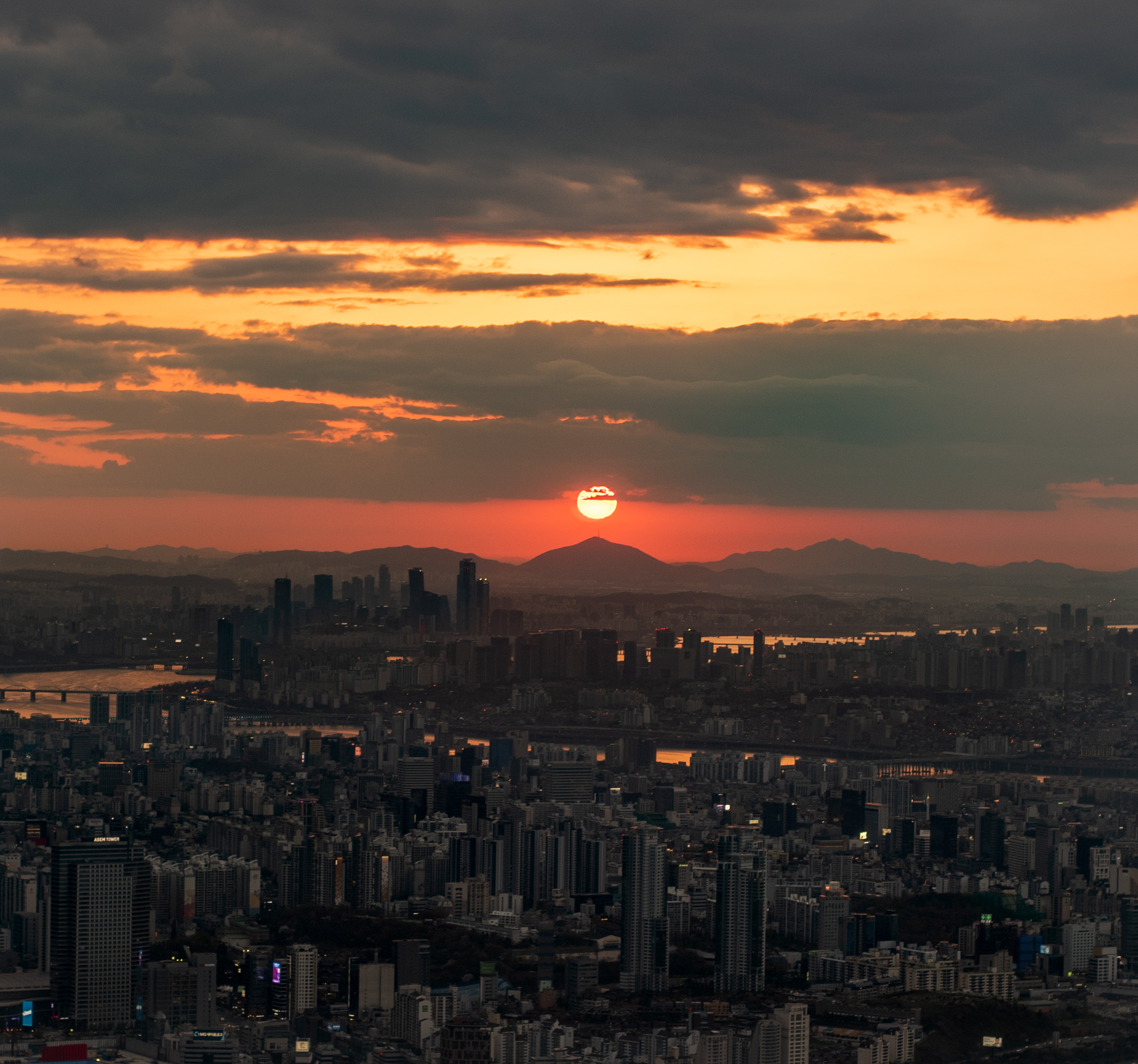 금색으로 빛나는 한강과 짙은 땅거미가 지는 서울도심, 산 뒤로 넘어가는 붉은 태양이 어우러진 사진입니다. 서울 도심의 고층건물들이 구석구석 있는 모습이 정말 아름답고, 휘어있는 한강의 모습이 사진에 부드러움을 추가해줍니다.