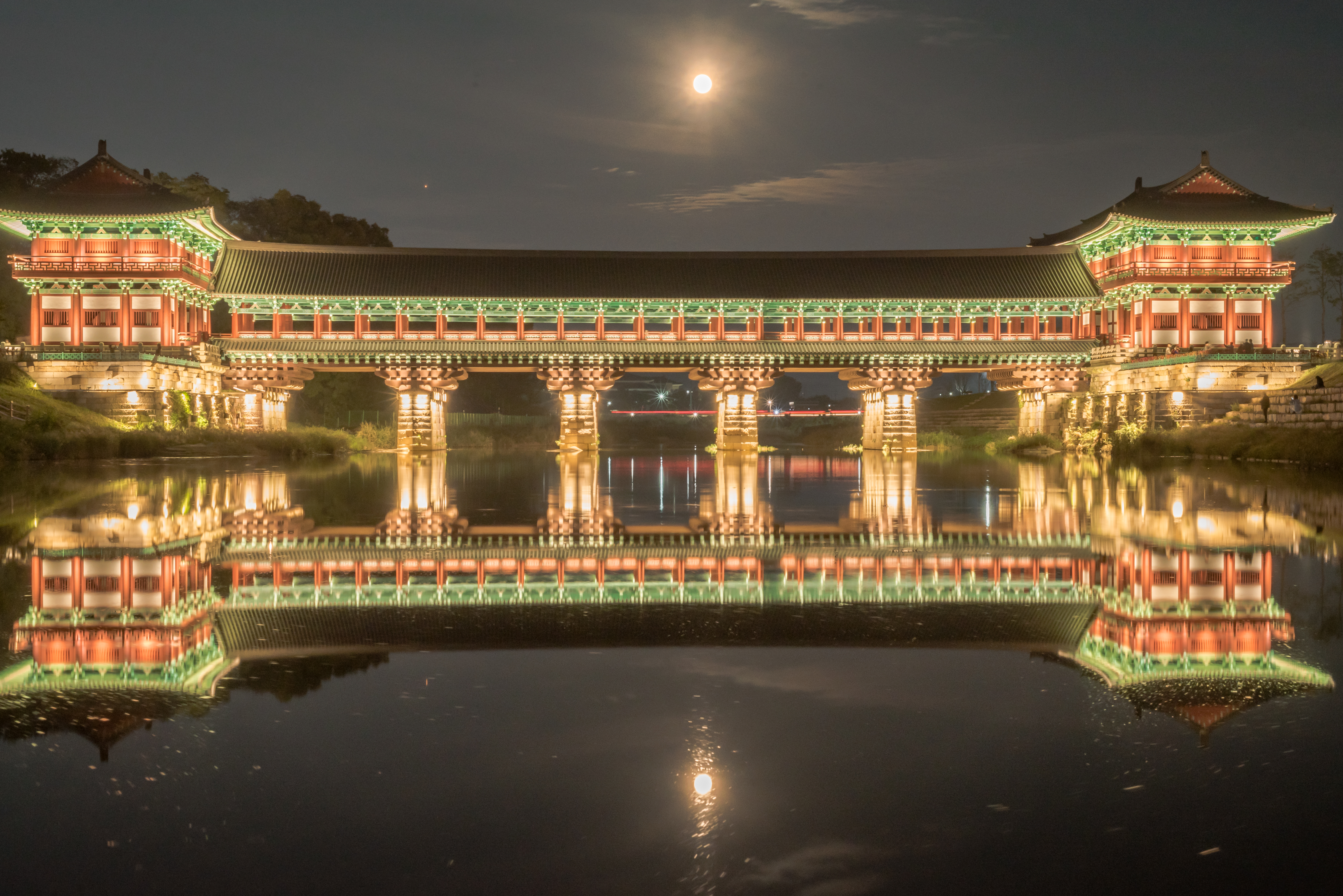 경주에 위치한 월정교는 밤이되면 매력이 배가되는 곳입니다. 깜깜한 주변과 대비대는 밝음으로 웅장함을 표현했고, 하늘에 떠오른 달빛이 하천에 반영이 되어서 더 인상적인 사진입니다.
