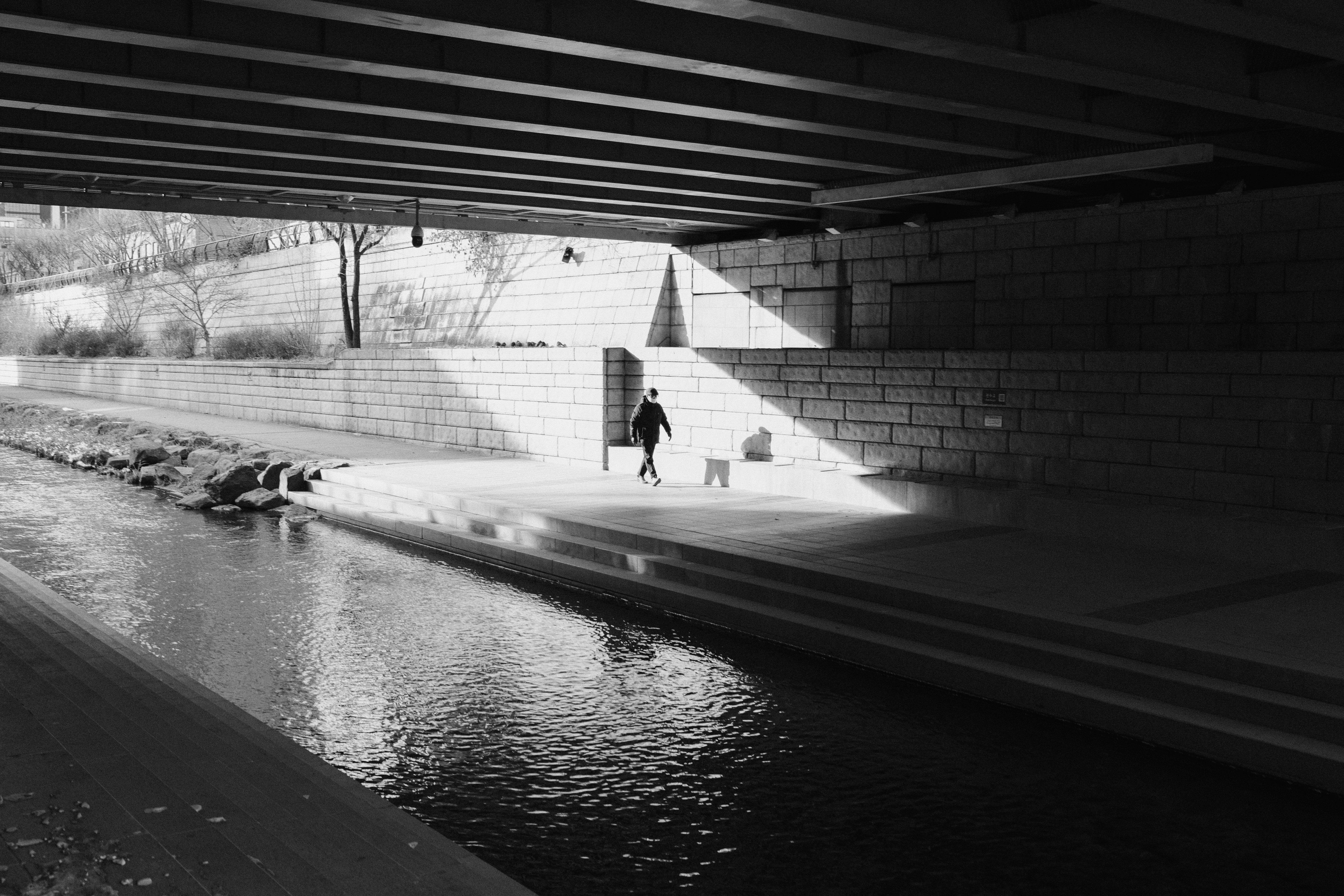 강한 조명아래 거리를 걸으면서