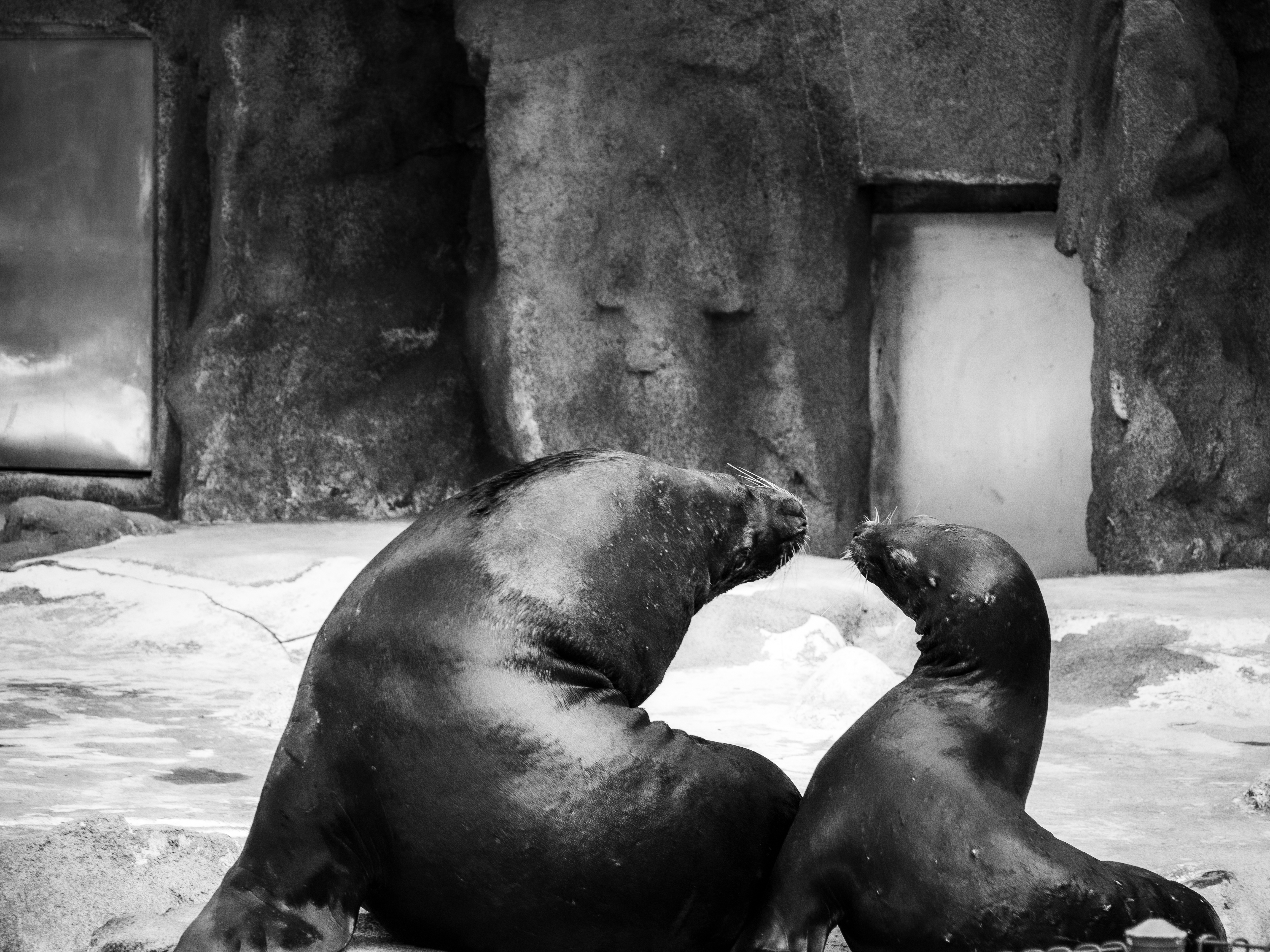 동물원의 바다사자 한쌍이 서로를 바라보고 있습니다.