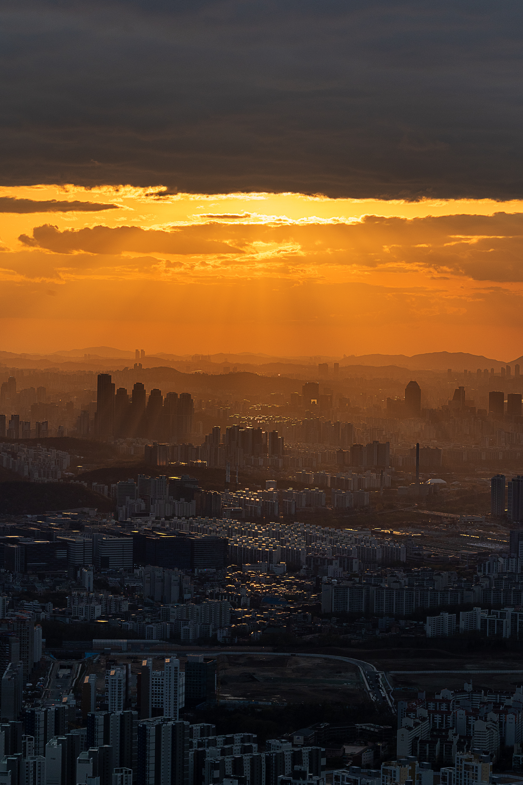 짙은 구름 사이로 빛이 내리는 서울 도심의 모습