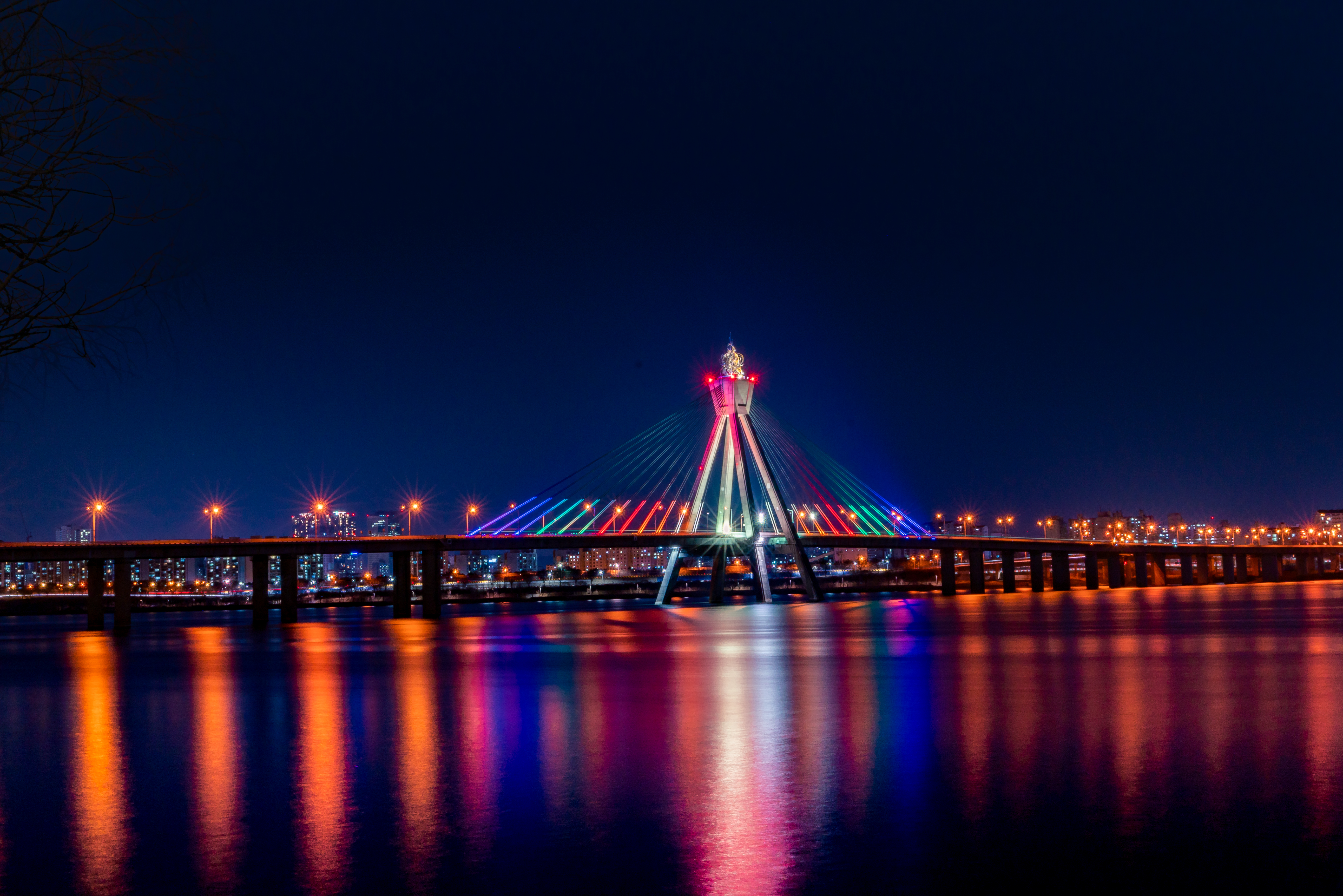 올림픽 대교의 다양한 색상의 조명으로 물든 한강