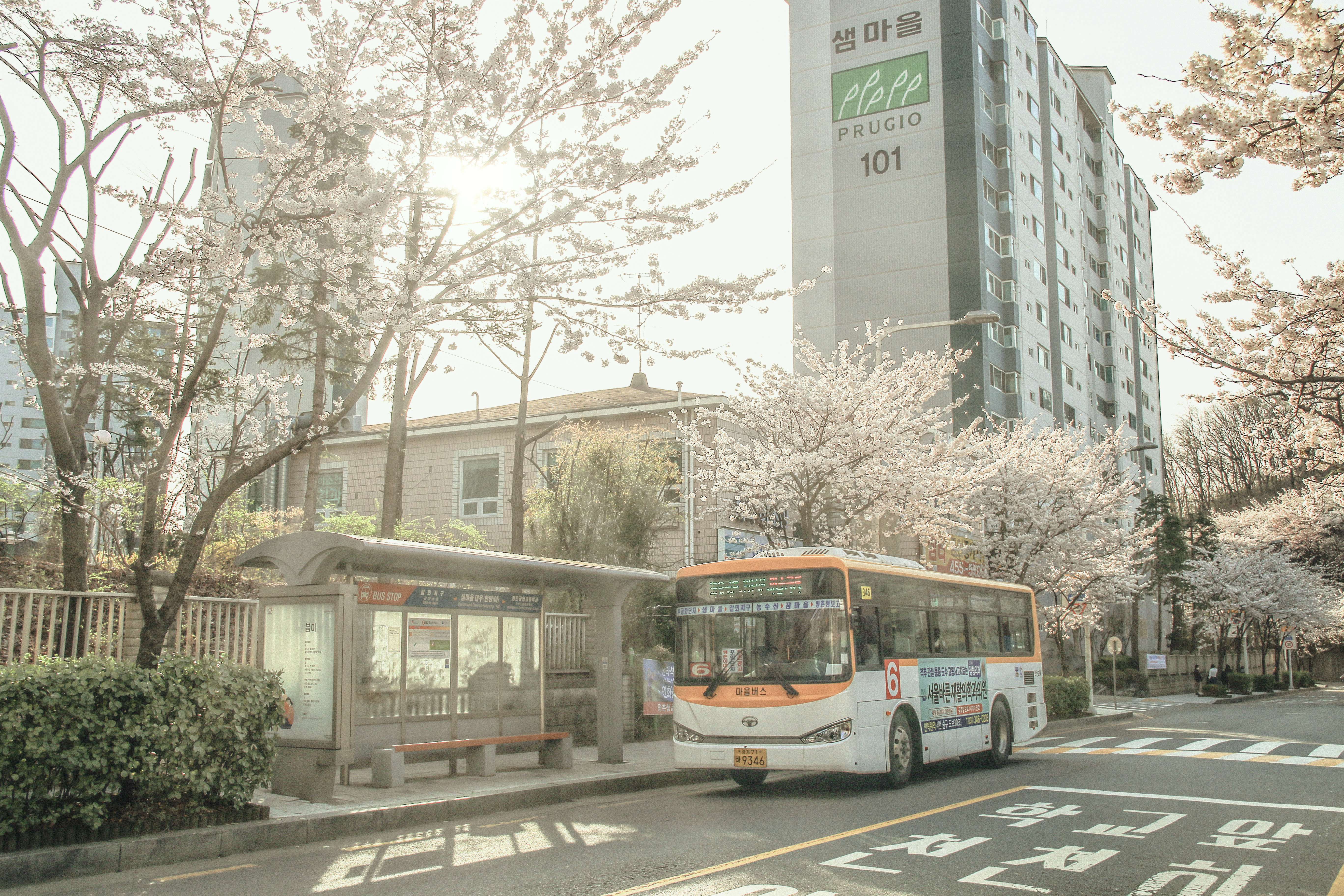 왕복 2차선의 작은 도로. 흐드러지게 핀 벚꽃 아래로 작은 마을버스가 고요한 도로를 지나고 있습니다.