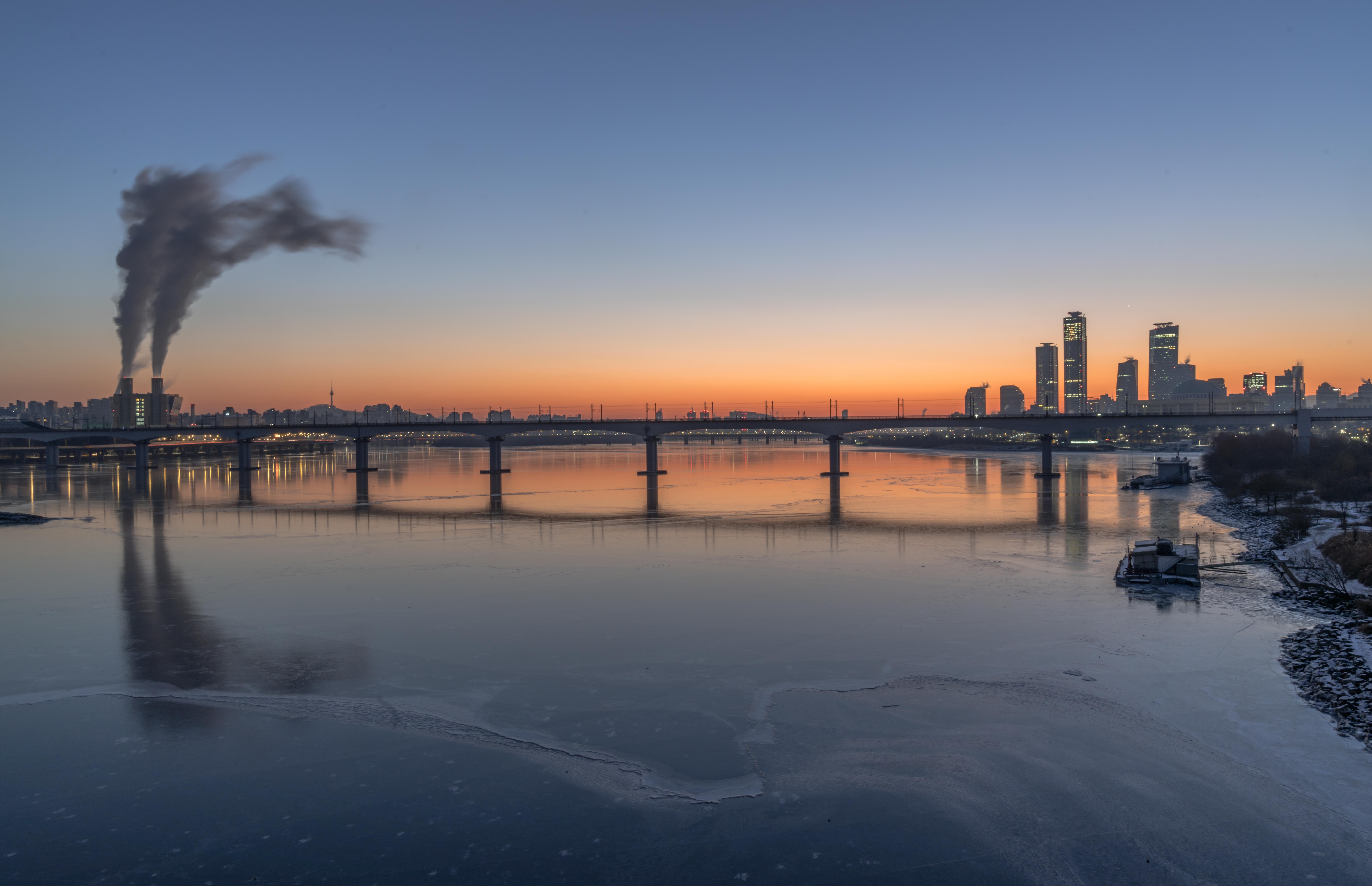 꽁꽁 얼은 한강과 아직 떠오르지 않은 해. 자연은 아직 깨어나지 않았습니다. 하지만 계속 피어오르는 연기와 밝게 불이켜진 빌딩은 자연보다 먼저 깨어난 듯합니다.이대로 계속 지속된다면, 이 지구의 주인은 자연이 아닌 인간이 될것같다는 생각에 촬영했습니다.