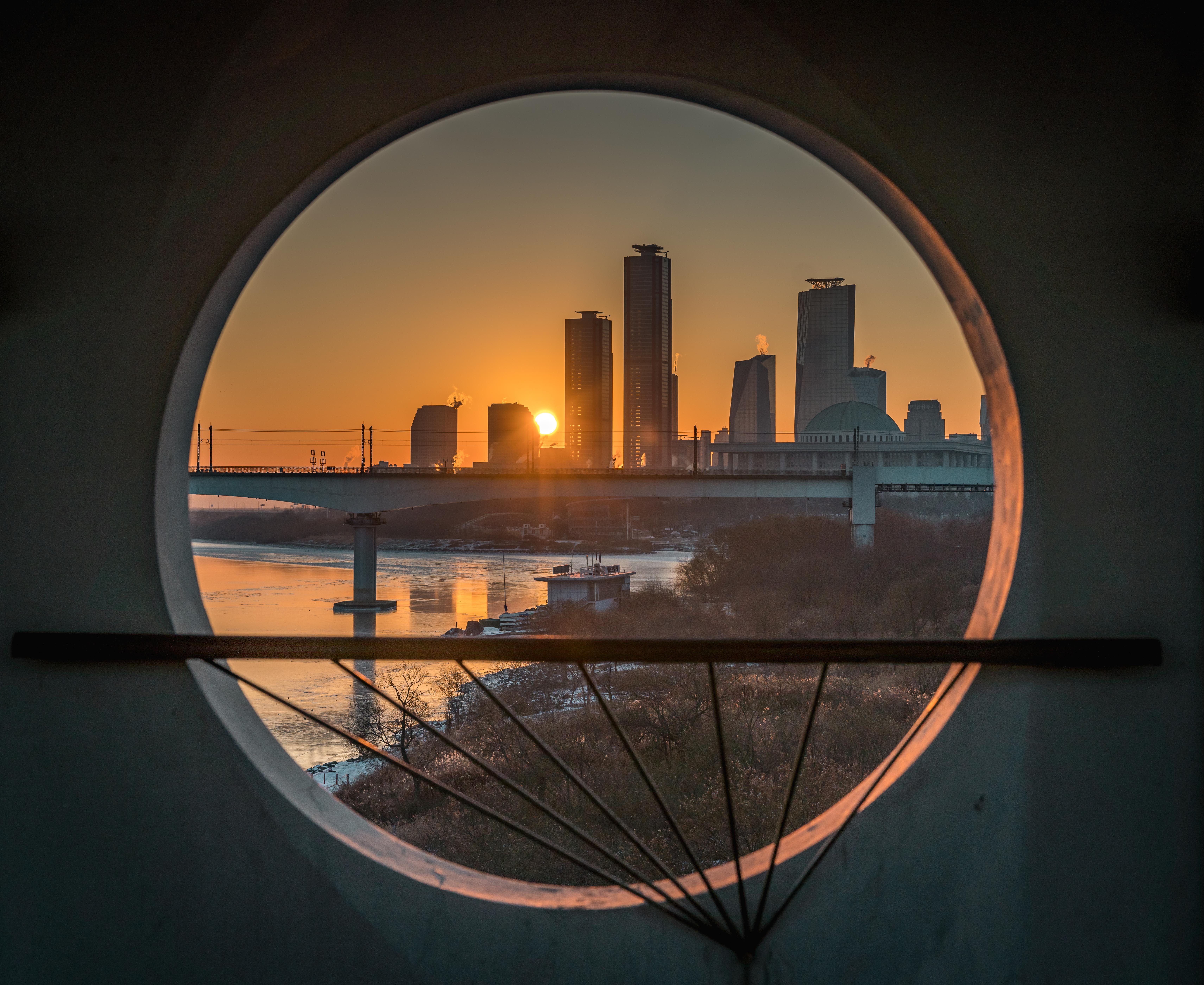 원형 프레임이 마치 영사기의 앞모습과 유사하게 생겼습니다. 원형 프레임 안에는 밝게 떠오르는 해와 아침을 시작하는 도시의 모습이 담겨있고, 이 모든것을 원형 프레임으로 감싸서, 부드러우면서 강렬한 느낌을 주도록 표현했습니다.