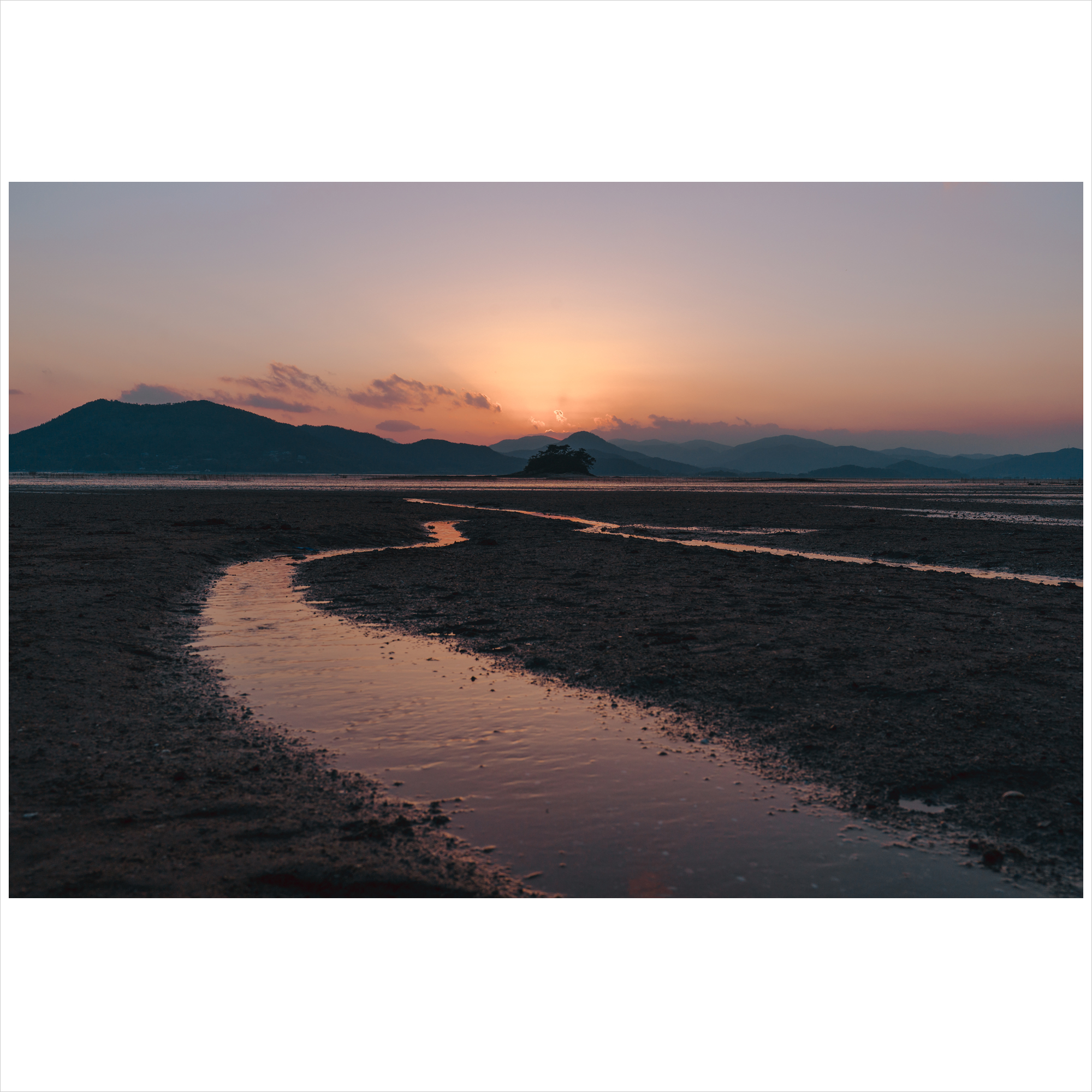 잔잔할 수 있는 노을 사진에 물길을 같이 담음으로써 역동감을 더해졌습니다.