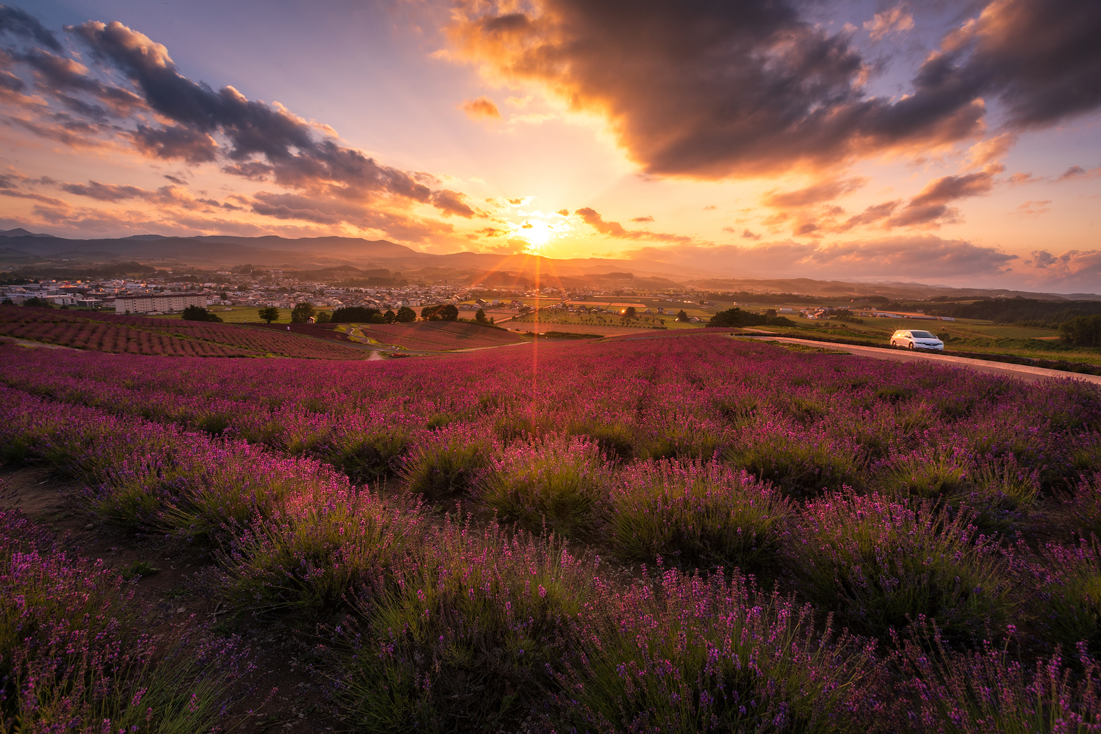 홋카이도 후라노의 라벤더 밭에 뜨거운 일몰빛이 쏟아져 보라색이 더욱 진하게 느껴졌던 저녁 풍경을 담았습니다.