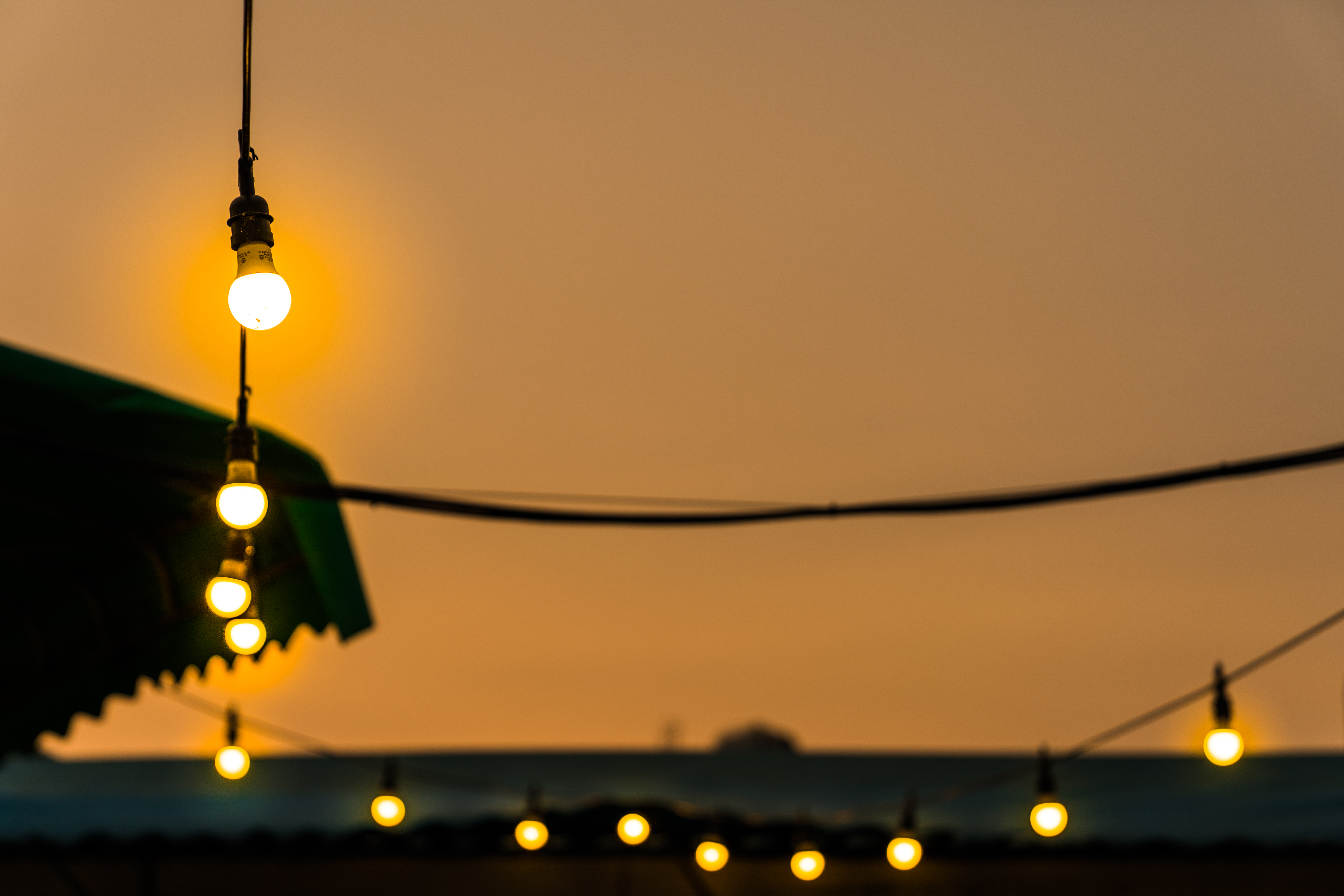 노랗게 물드는 하늘과 켜진 전구가 따뜻한 느낌을 주네요.