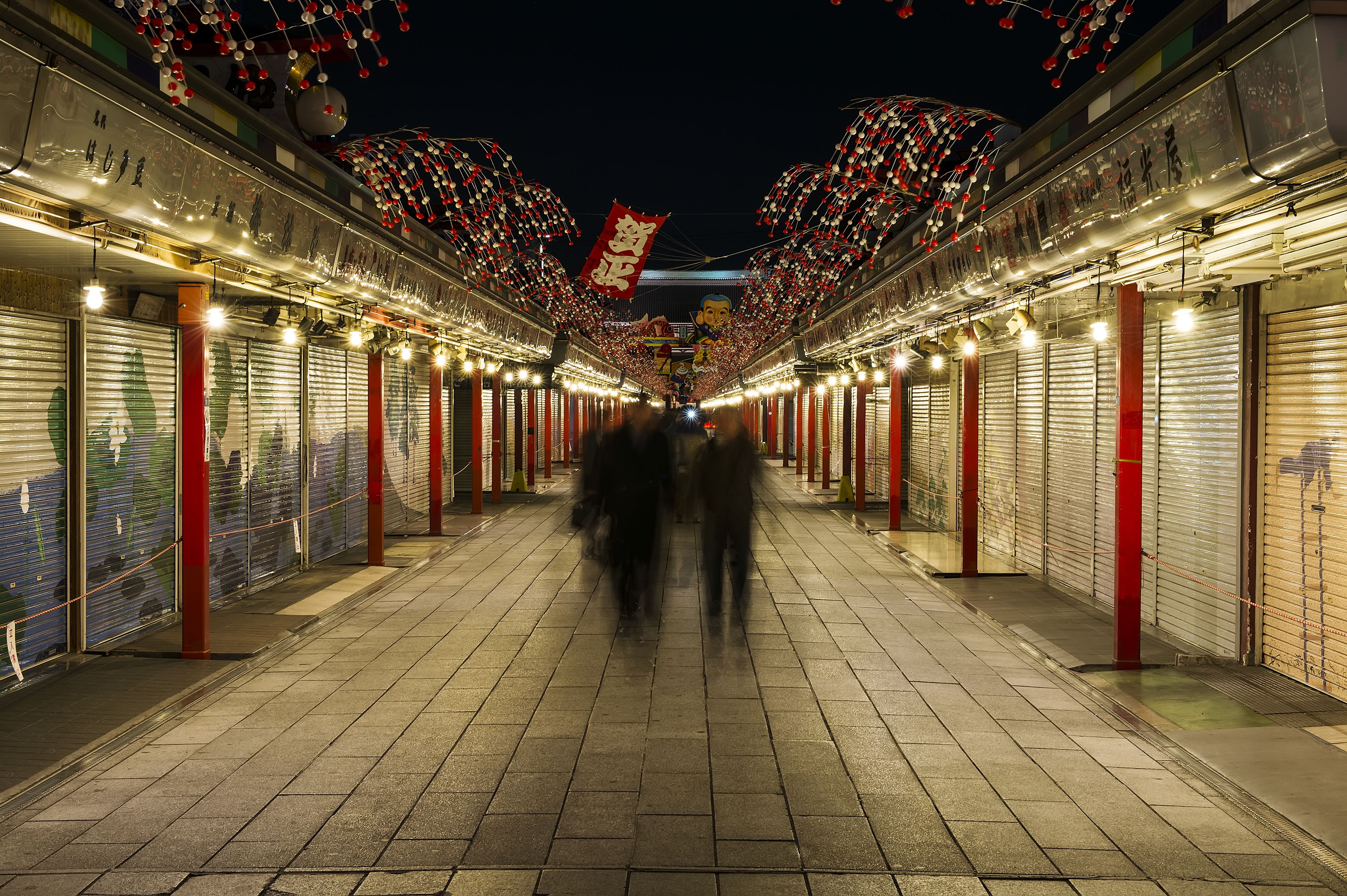 혼잡한 낮을 지나 차분해진 발걸음 소리만 들리는 따뜻한 아사쿠사 거리