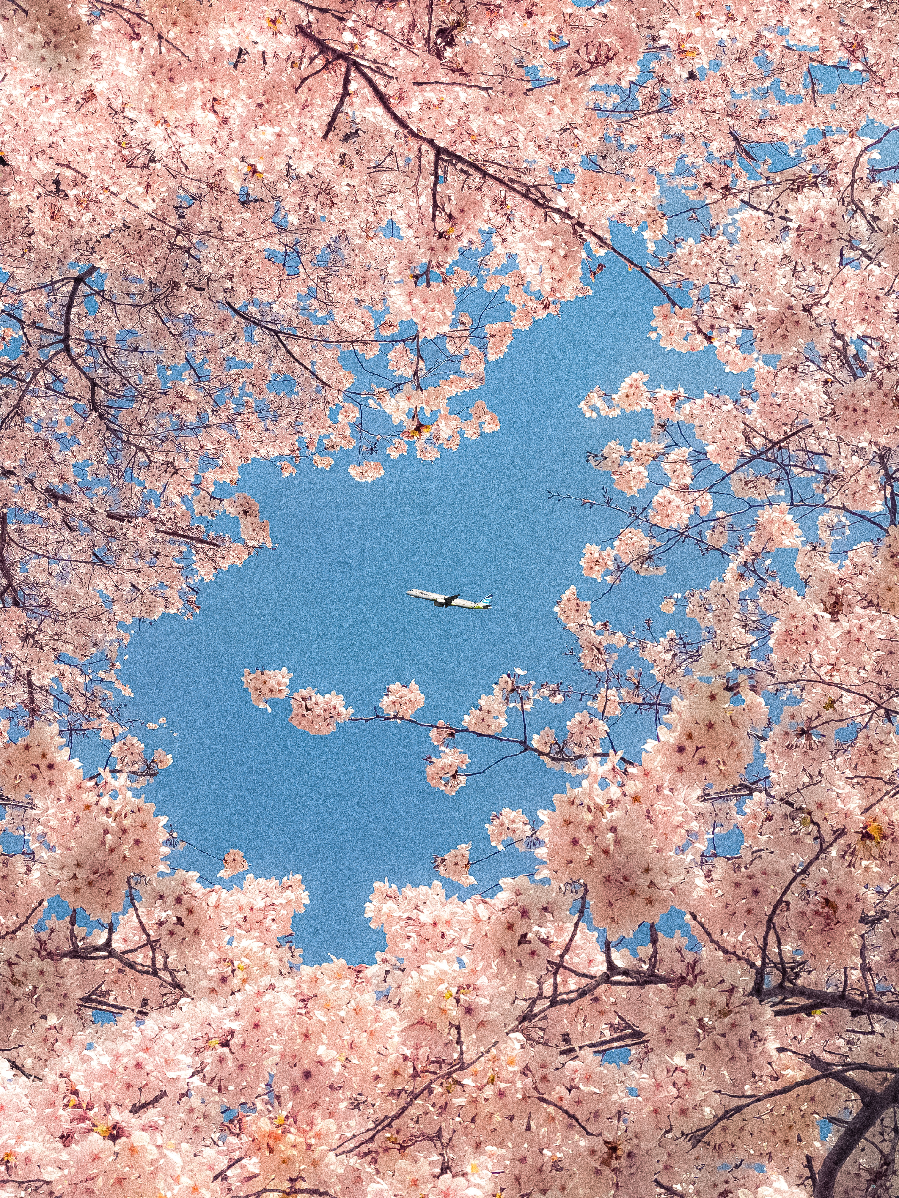 만개한 벚꽃 프레임 속 이륙하는 비행기