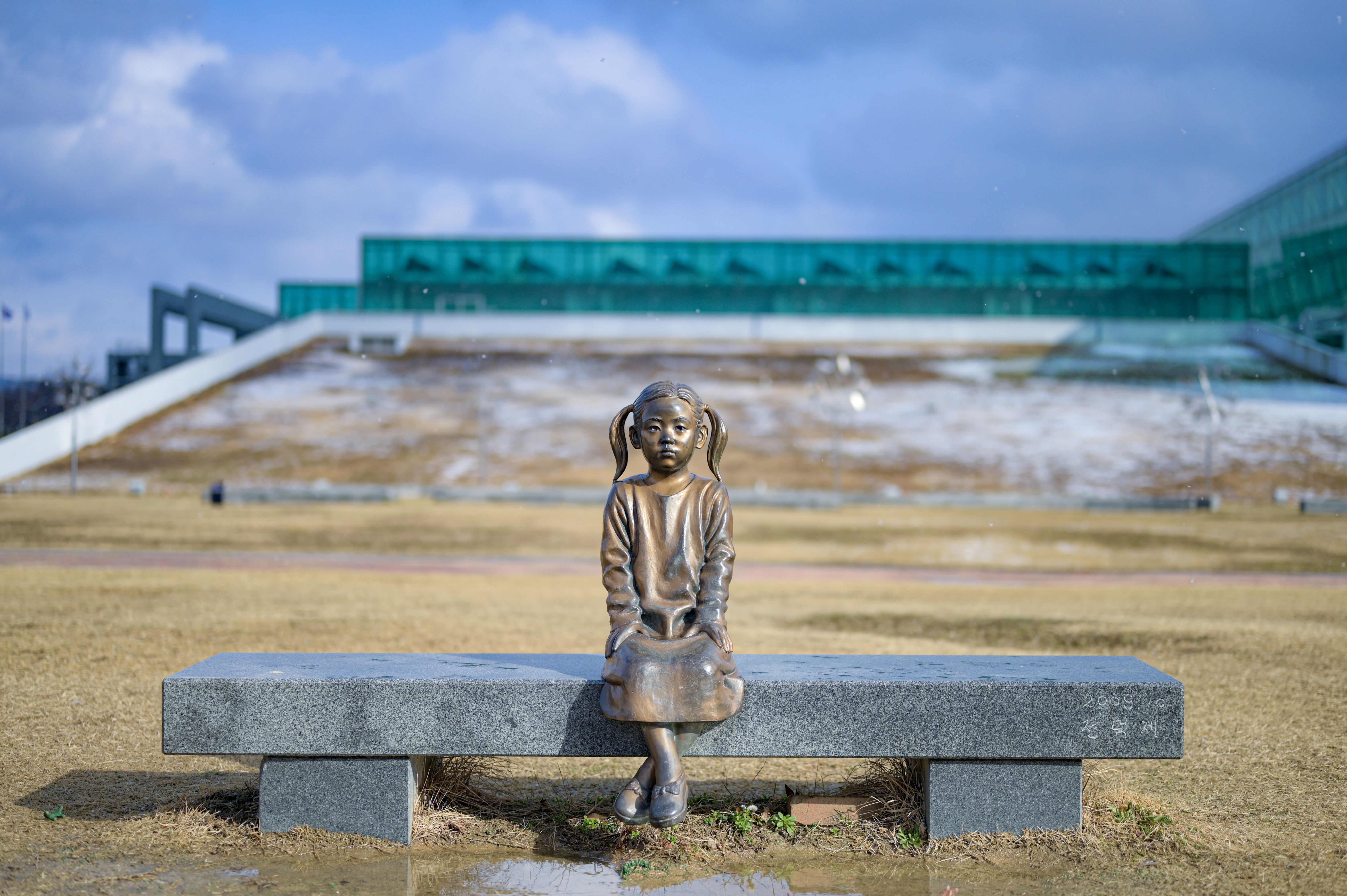 눈 오는 겨울에 쓸쓸한 소녀 조형물