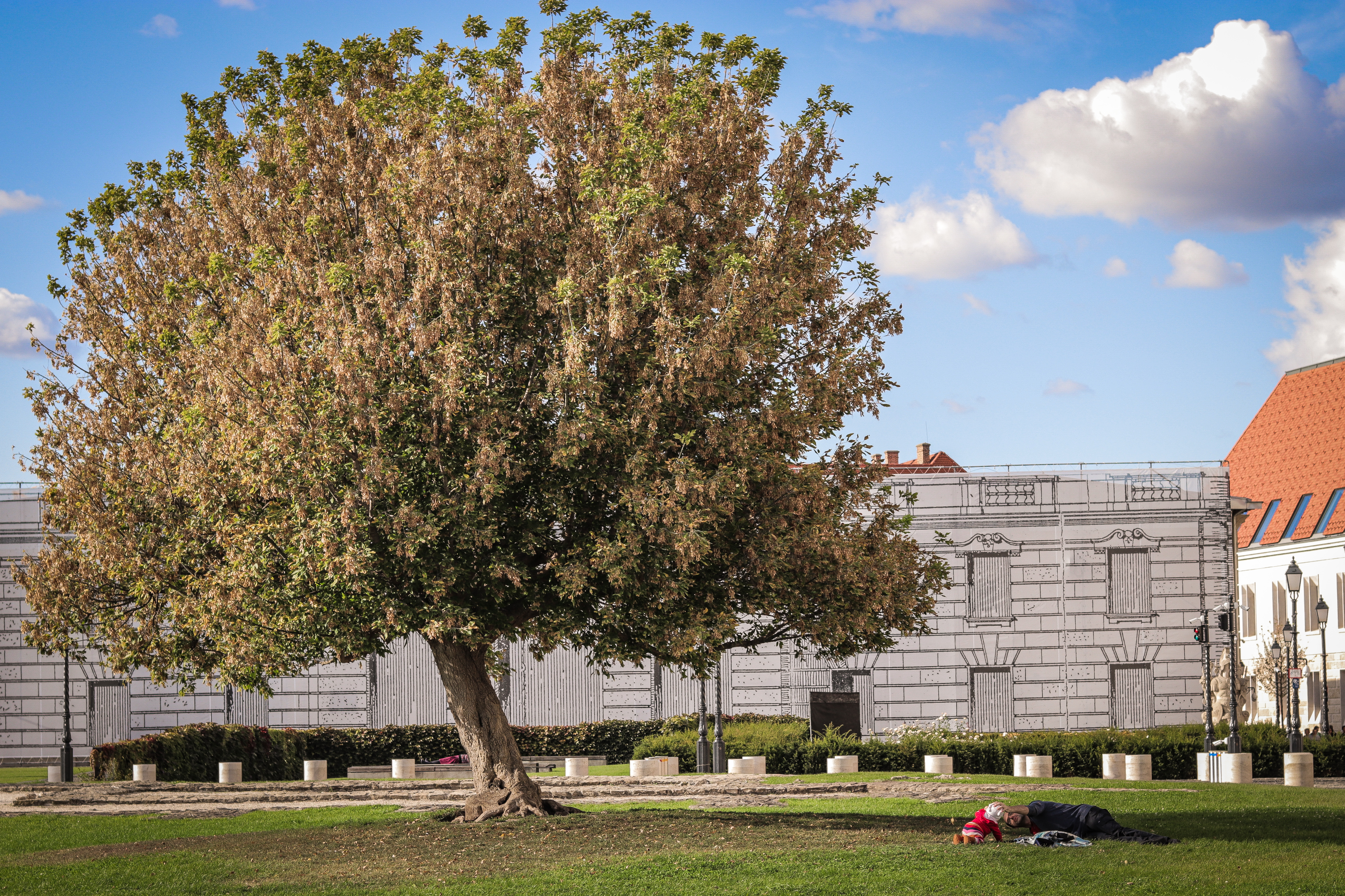 나무 그늘아래 어린딸을 사랑스럽게 쓰다듬아주고 있다