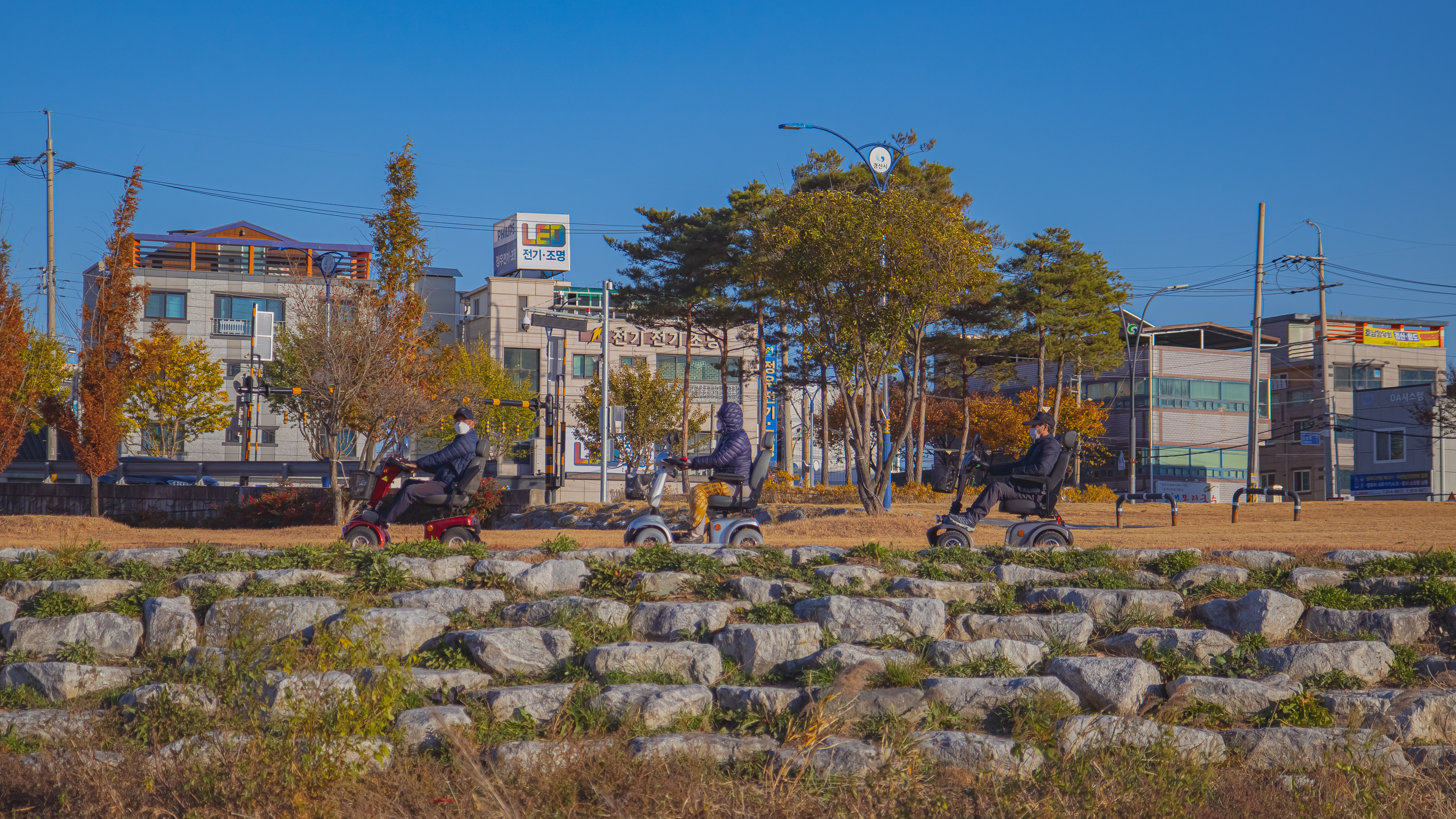 전동휠체어를 타시는 어르신들이 일정한 간격을 유지하고 운전을 하시는모습에 재밋기도 하고 멋지기도 하여 찍엇던 사진입니다.찍는동안 유명한 그 사진 비틀즈의 애비로드 사진을 연상케 하는 느낌도 아주 살짝 들기도 하여 한편으론 재밋는 한컷으로 기억에 남습니다.