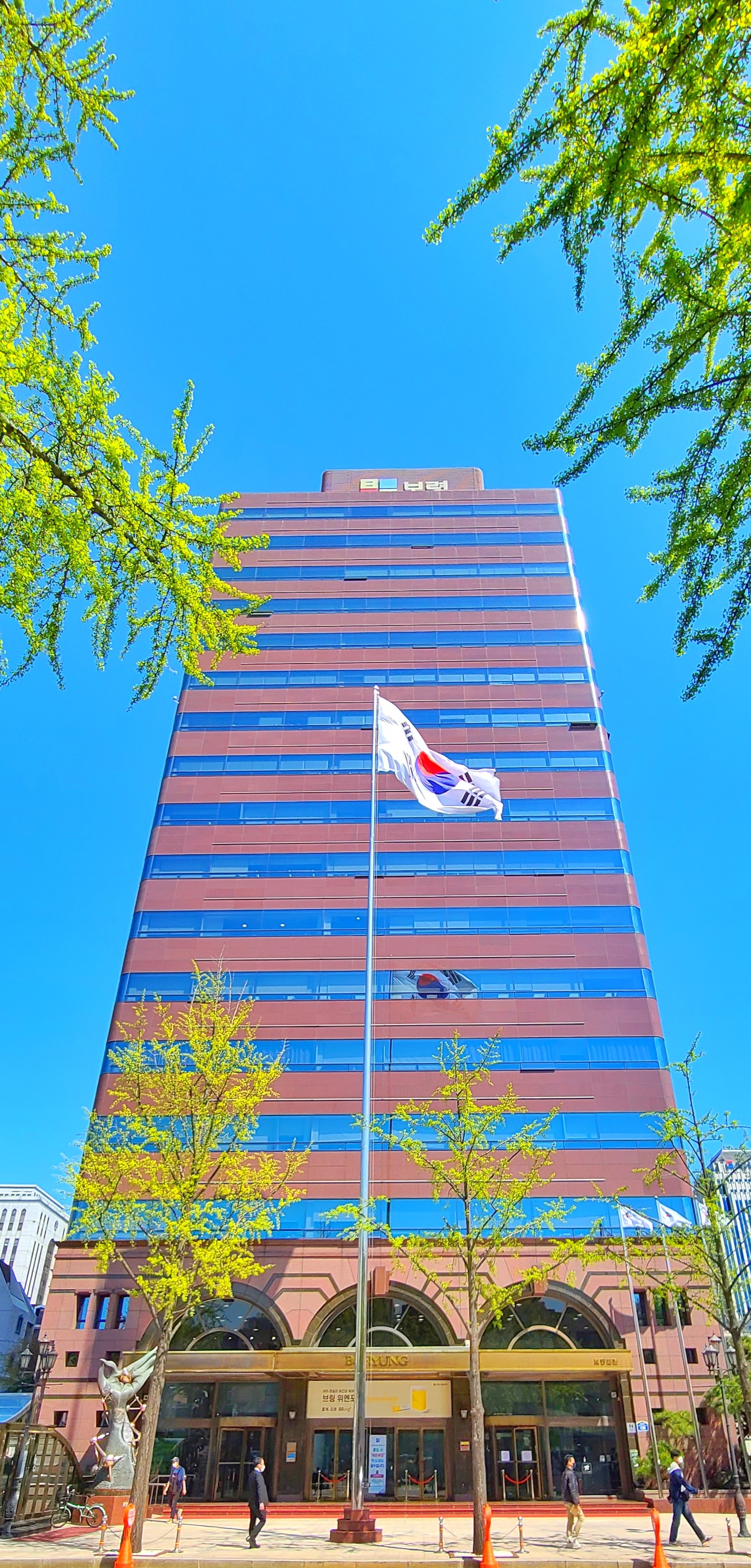 높은 빌딩 앞에 커다란 태극기가 펄럭이는게 인상적이네요