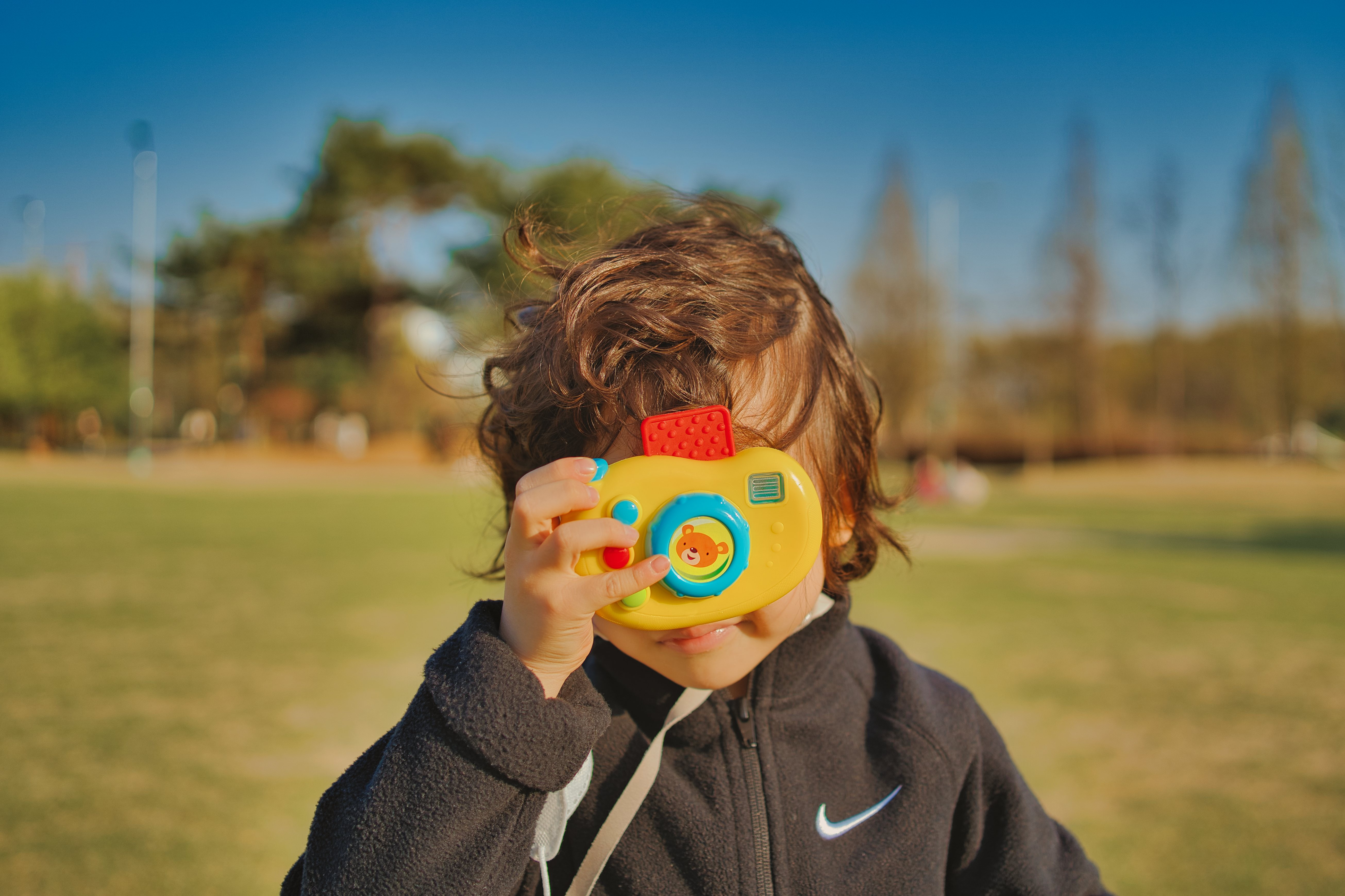 장난감카메라로 아빠를 찍어주는 아들입니다
