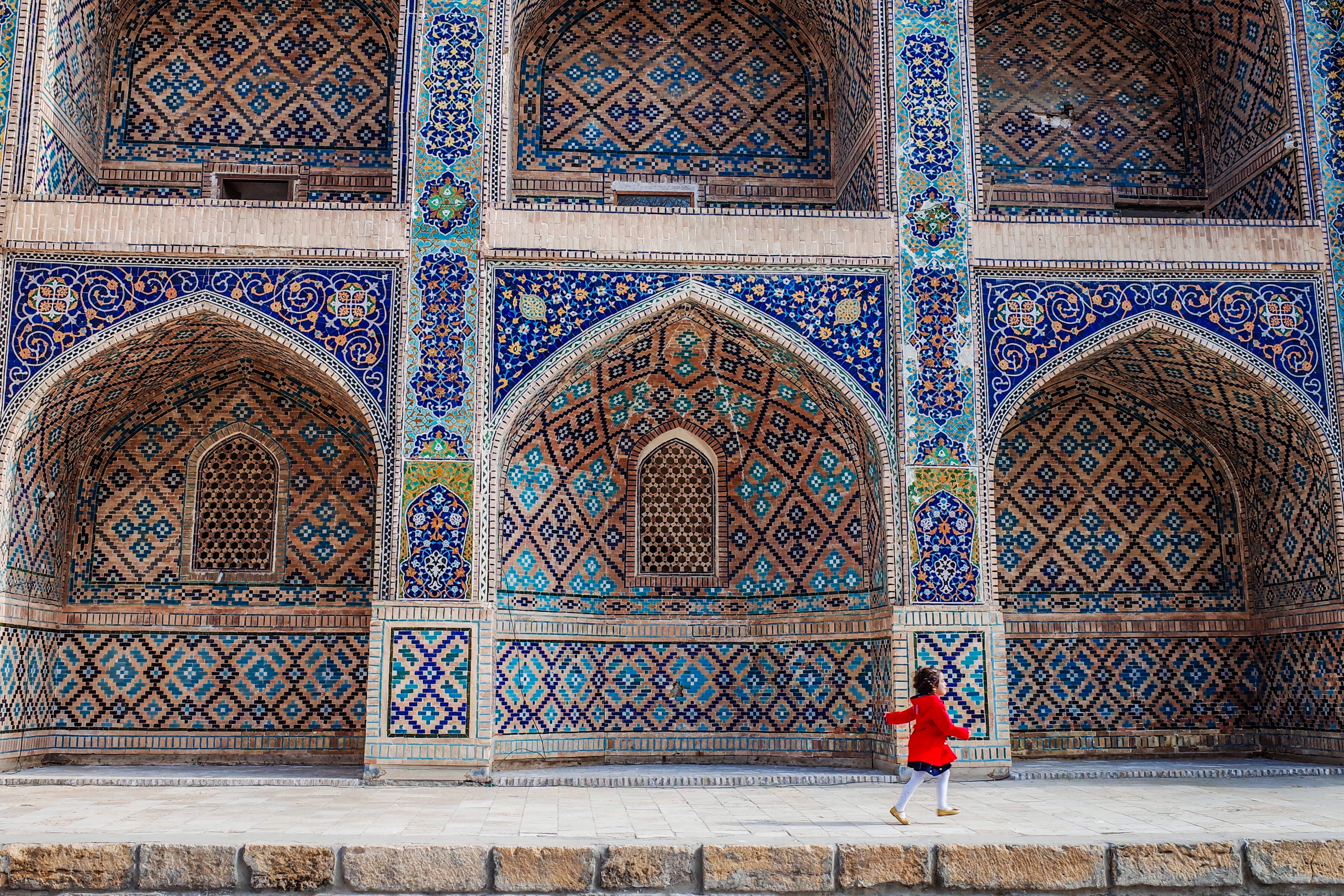 역사적인 건물을 배경으로 빨간 옷을 입은 아이가 뛰노는 모습이 눈길을 사로 잡습니다.