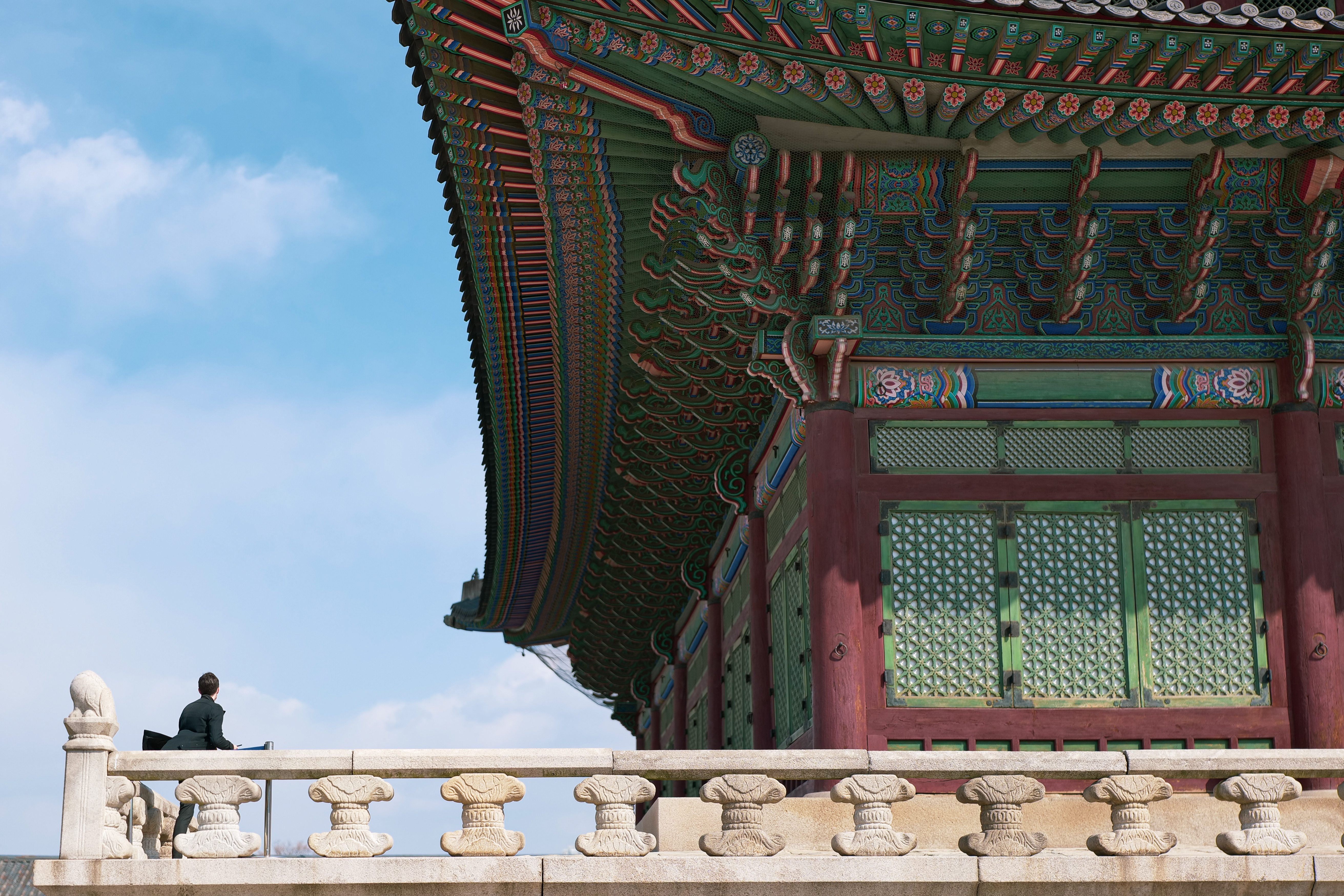 경복궁을 구경중인 외국인과 고궁을 담은 사진입니다