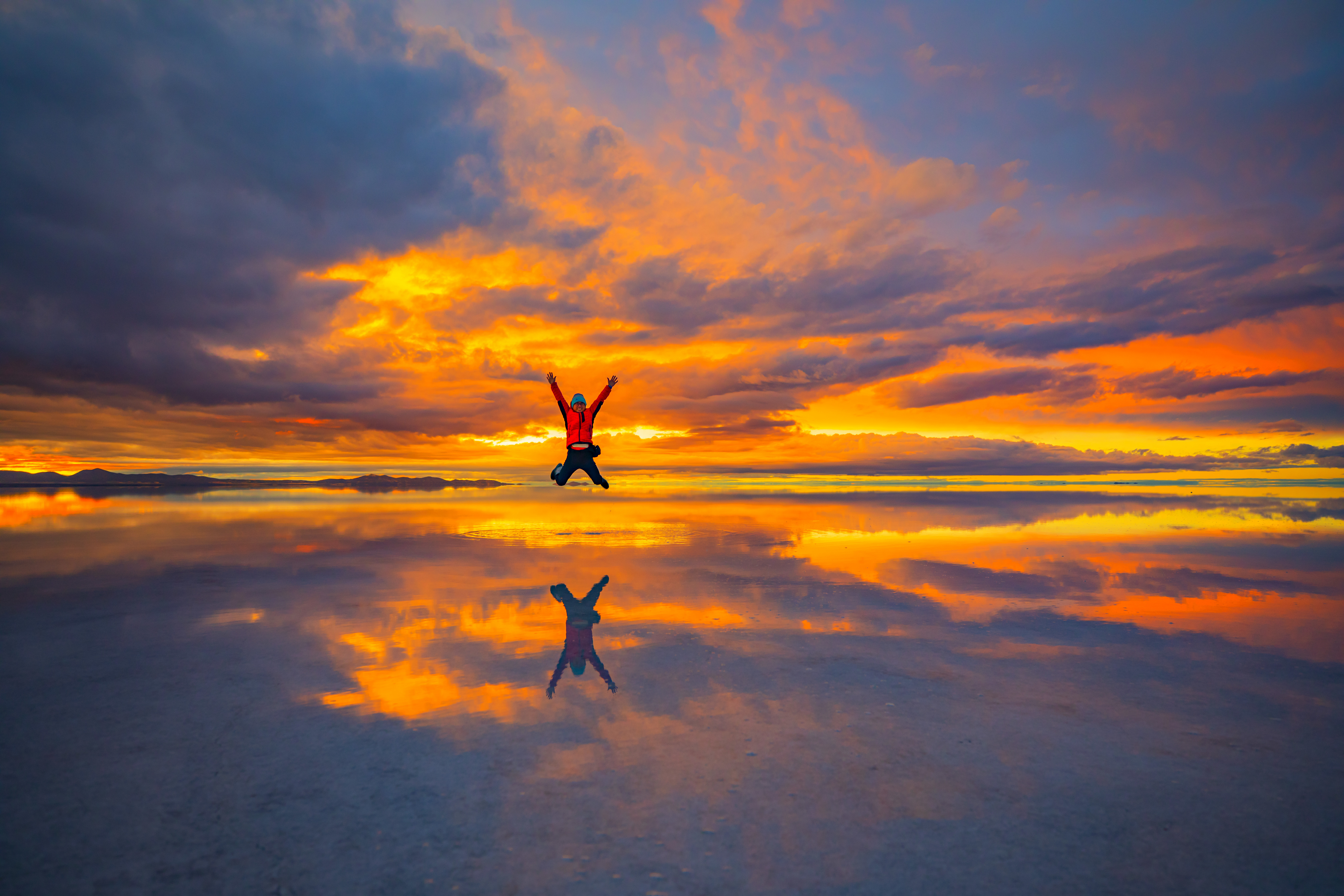 남미 볼리비아 우유니 소금 사막으로 버킷리스트 촬영을 위해 인생샷을 담고자 출발 하였다.우기에 맞추어 2월에 출발하여 아침 여명빛이 멋진 아침에 너무나 황홀하여 점프샷 하는 모습을 촬영하였다.