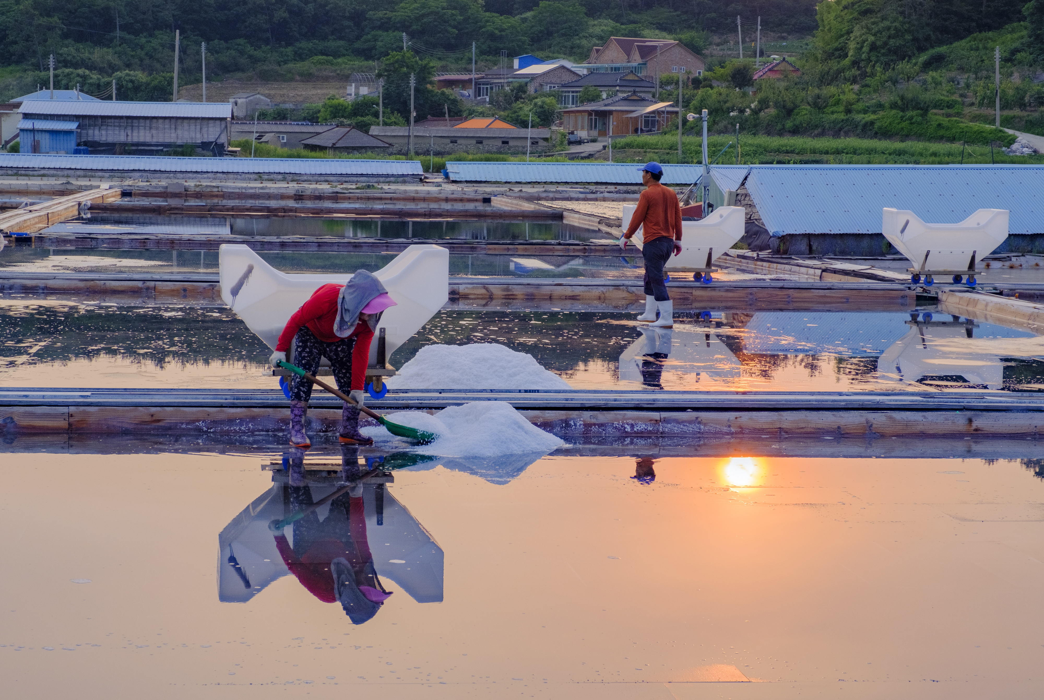 전남 증도 염전에서 소금을 갈무리하는 삶의 모습입니다.