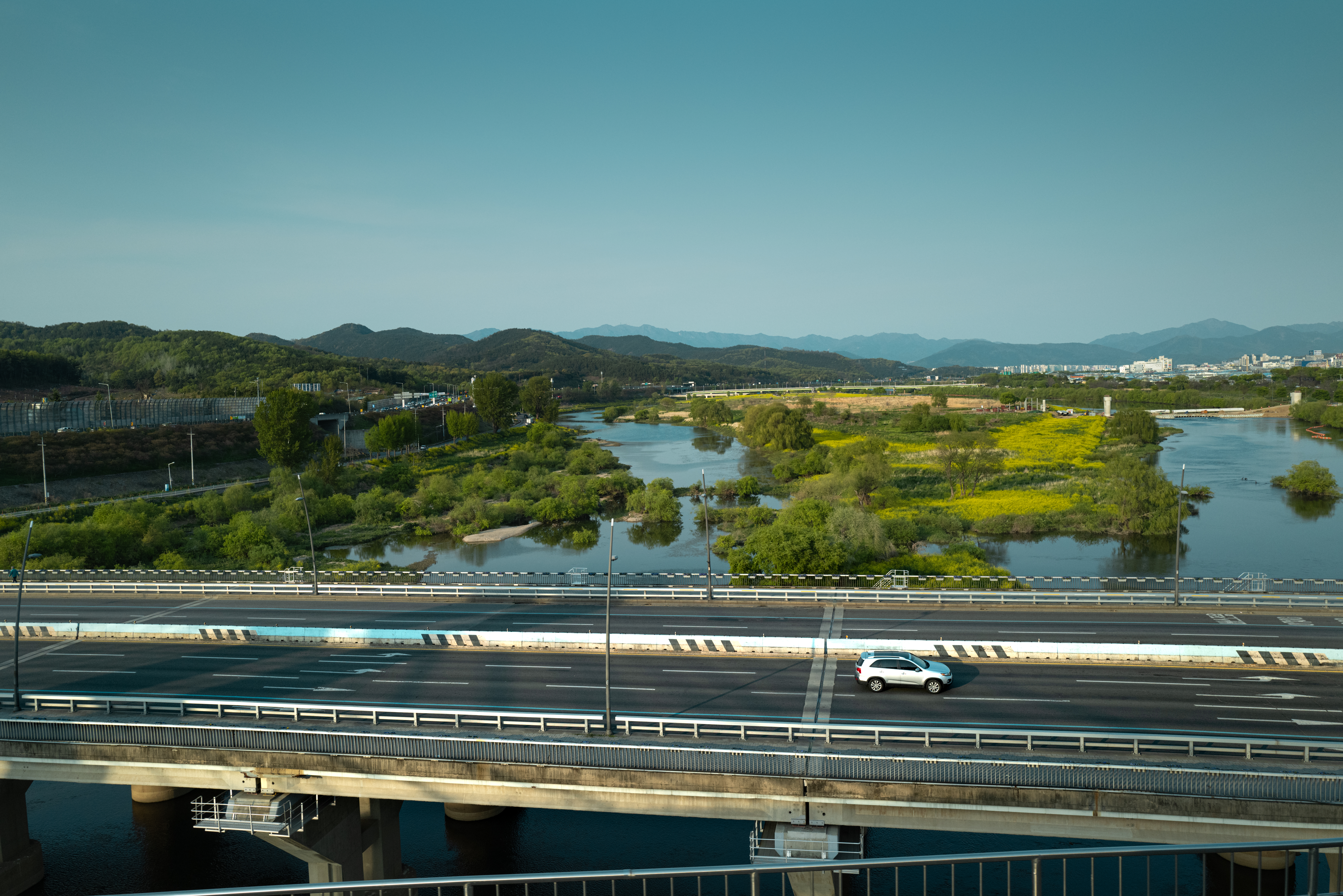 잠시 텅빈 도로를 하천의 유채꽃을 배경으로 달리는 한대의 자동차가 영화의 마지막 장면처럼 보였기에그옆에서 지상철를 타고 창밖을 보다 급히 셔터를 눌렀습니다.
