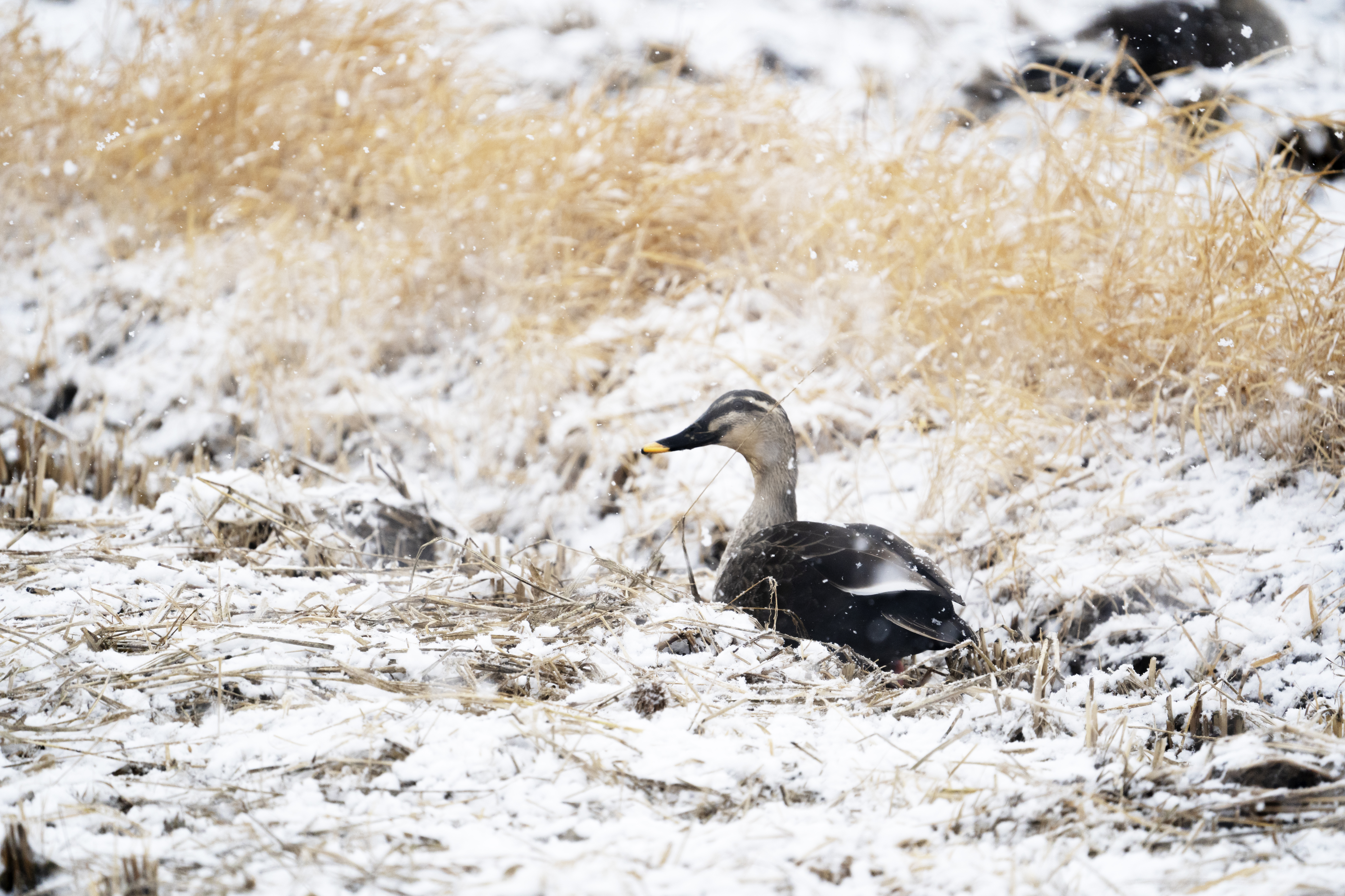 눈이 오는데 밭에서 먹이를 찾아다니는 흰뺨검둥오리 입니다.