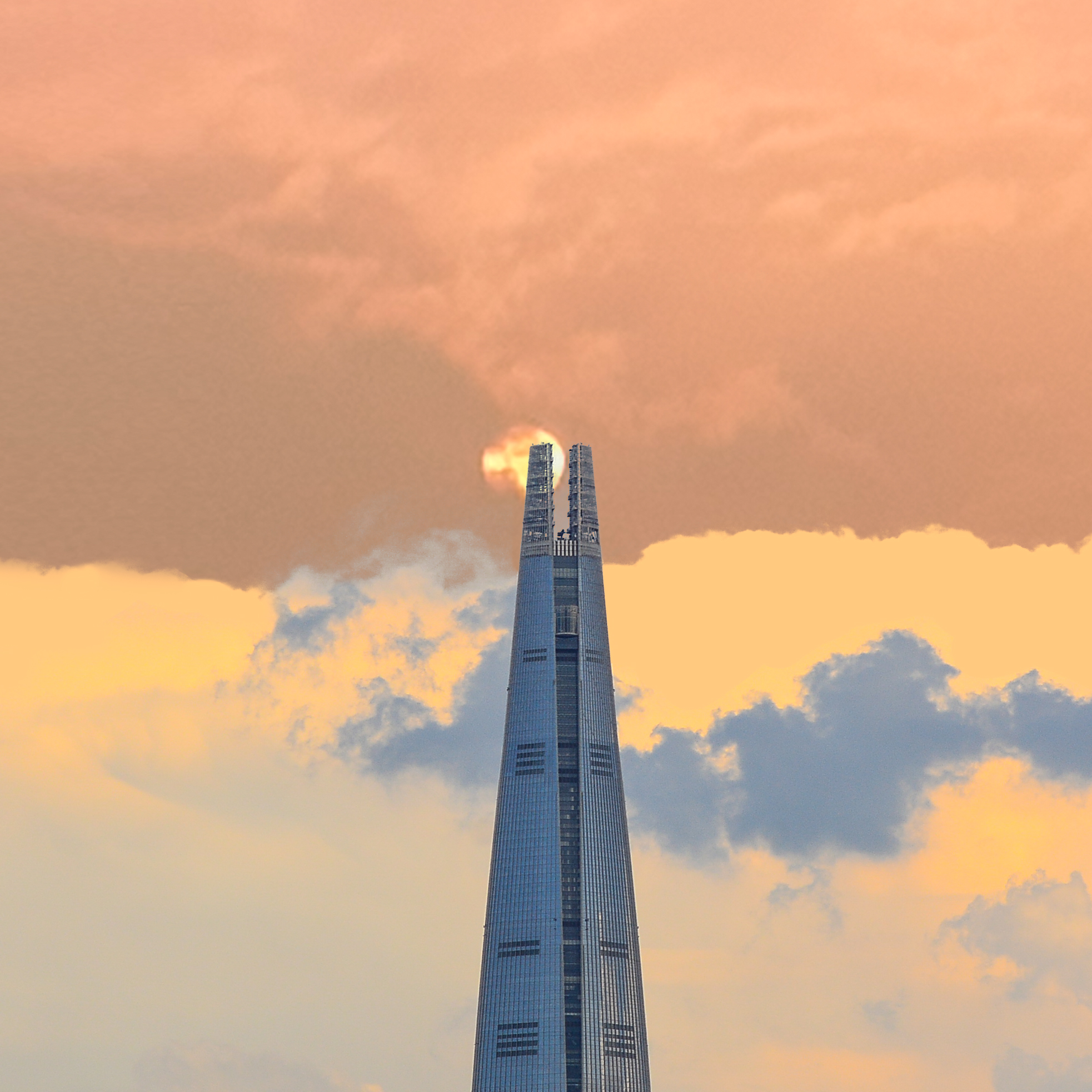 롯데타워 뒤로 해가 지고 있습니다.