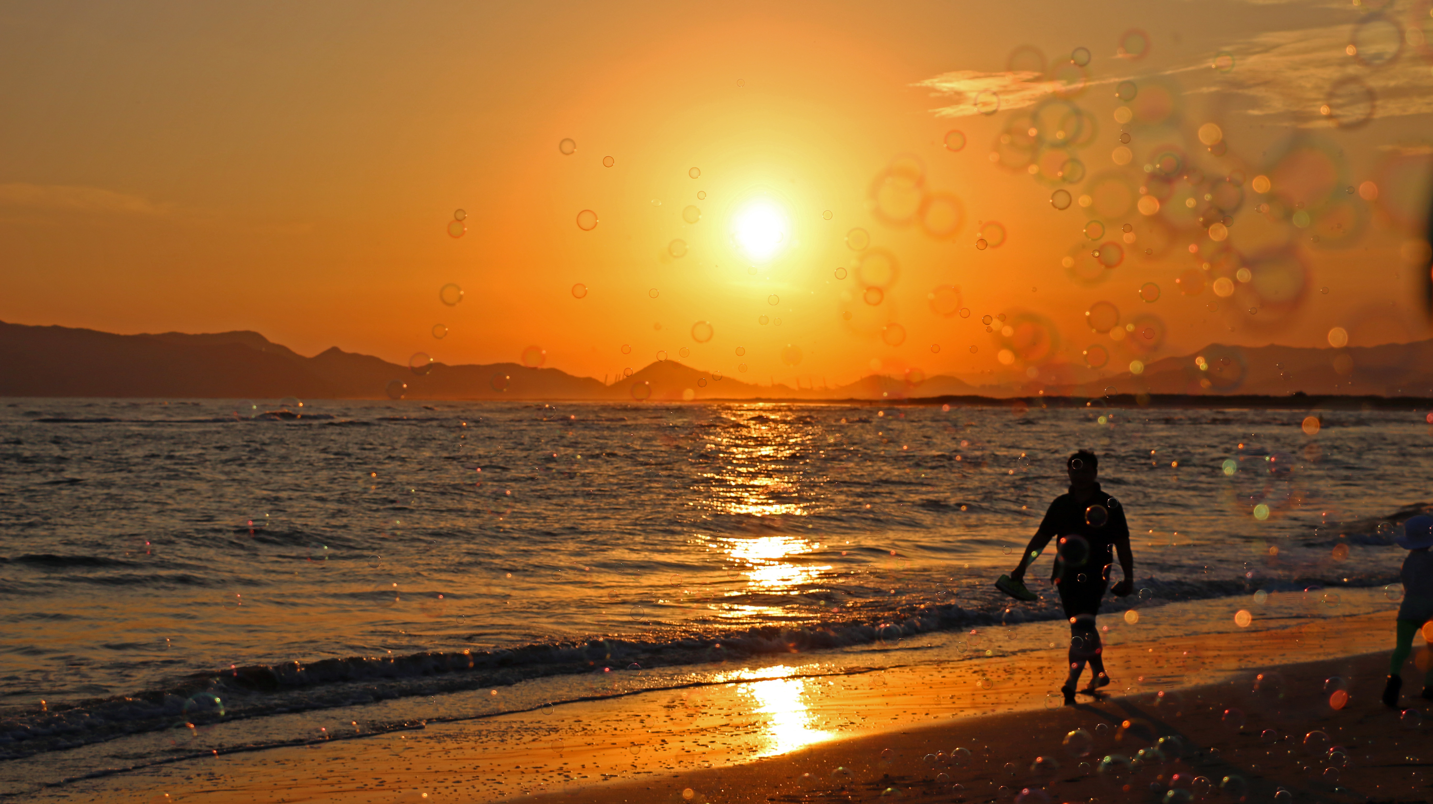 연출을 하지 않은 상태에서 비눗방울이 바람에 날려오는 모습과 해질녘 해변을 맨발로 걸어가는 남자의 순간을 포착해보았습니다