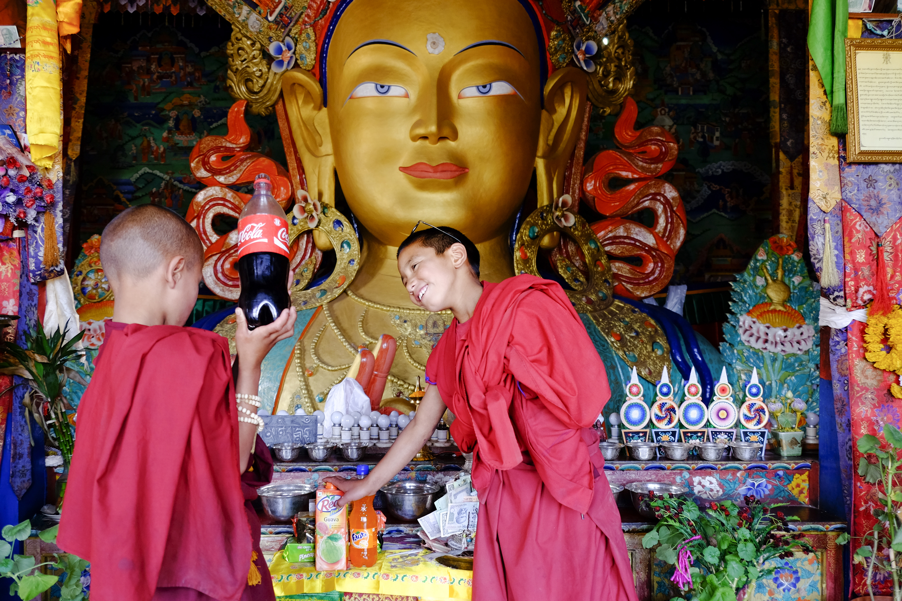 라다크 인근 테베트 불교사원인 곰파 법당 내에서 천진난만하게 노는 동자승의 모습입니다.