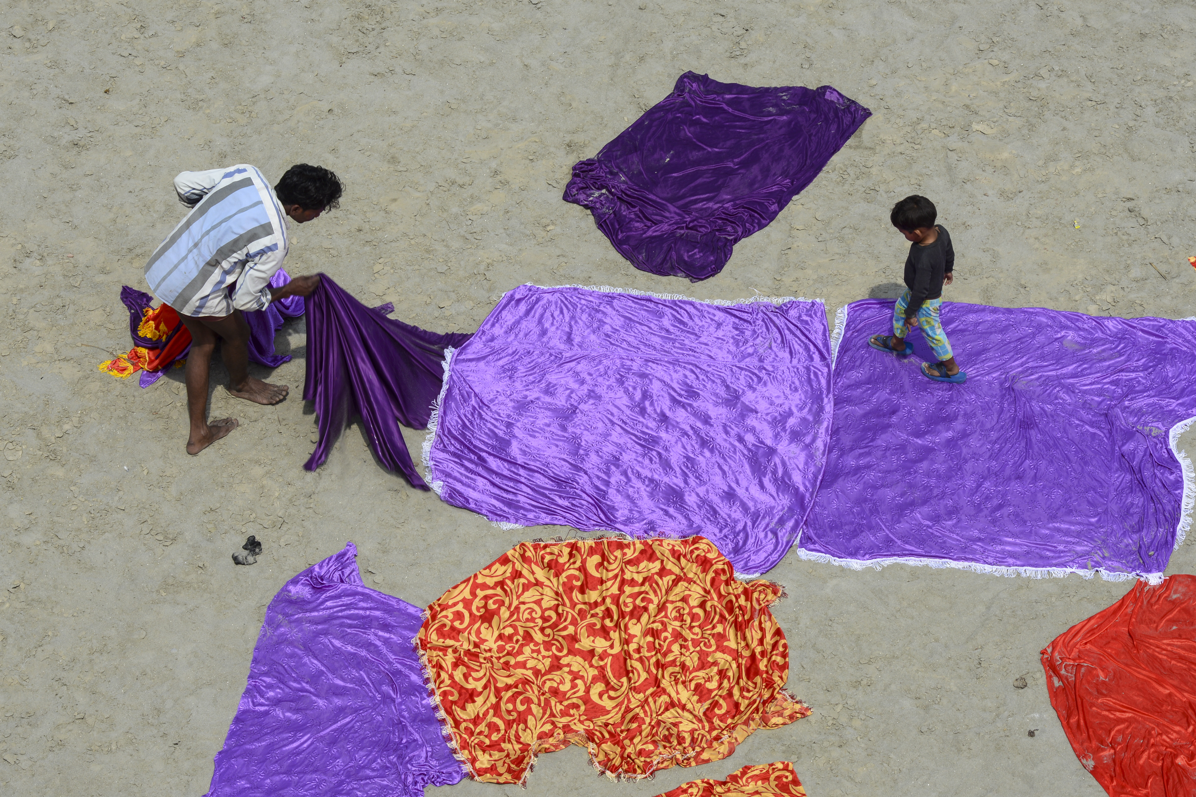 인도 아그라 야무나 강 백사장에서 말린 빨래를 갈무리 하고 있는 모습입니다.