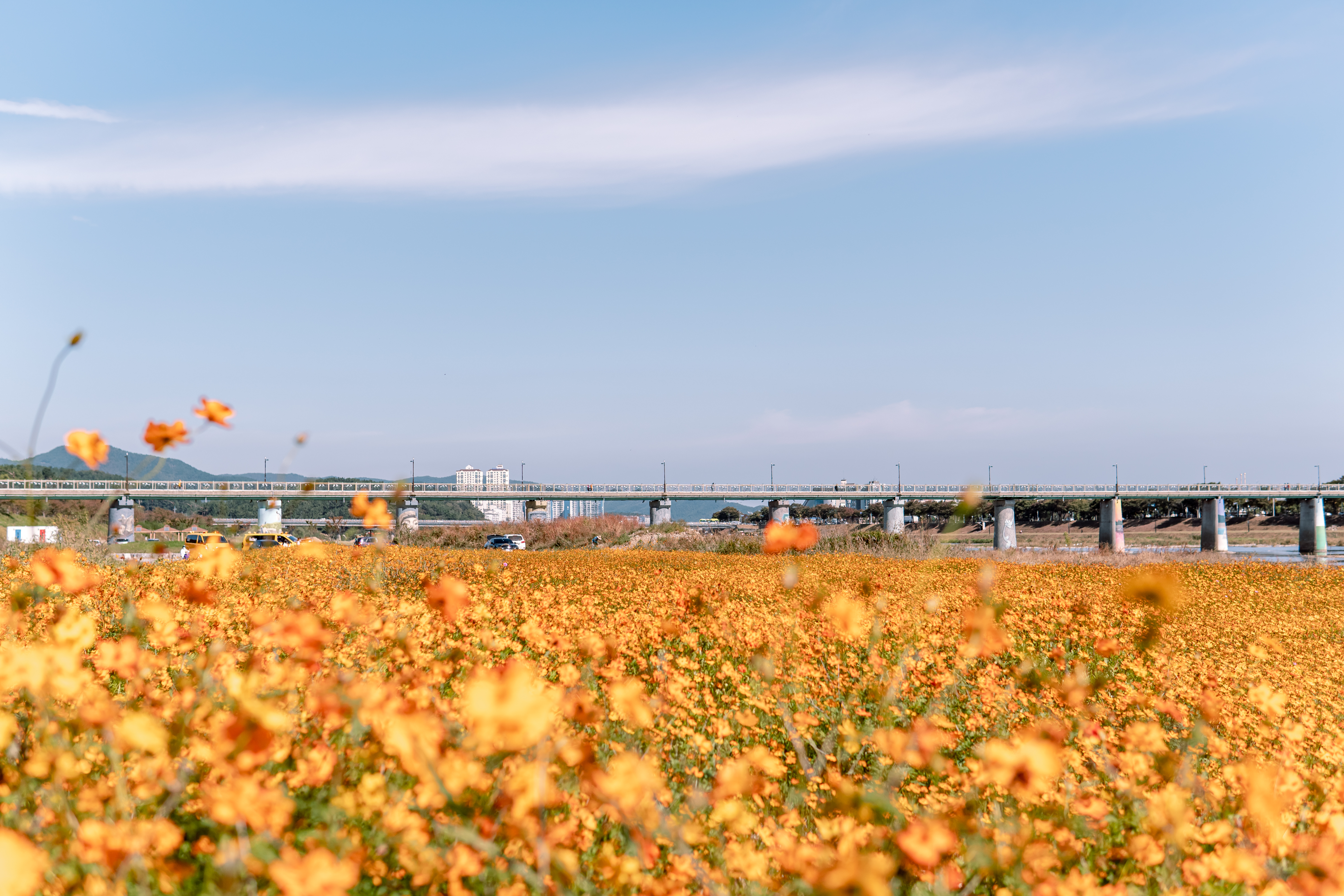경주 서천둔지에 피어난 황화 코스모스와 장군교의 가을을 담았습니다.