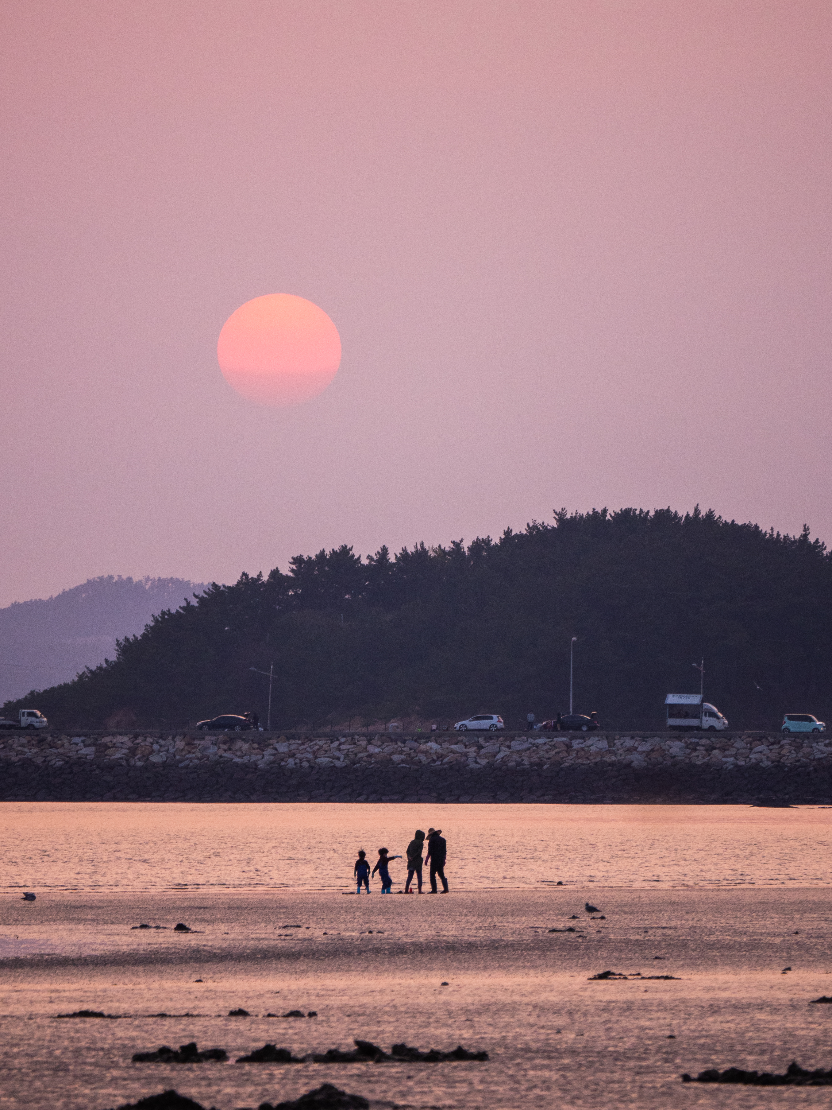 저물어 가는 해가 드리운 몽산포 해수욕장에서의 가족