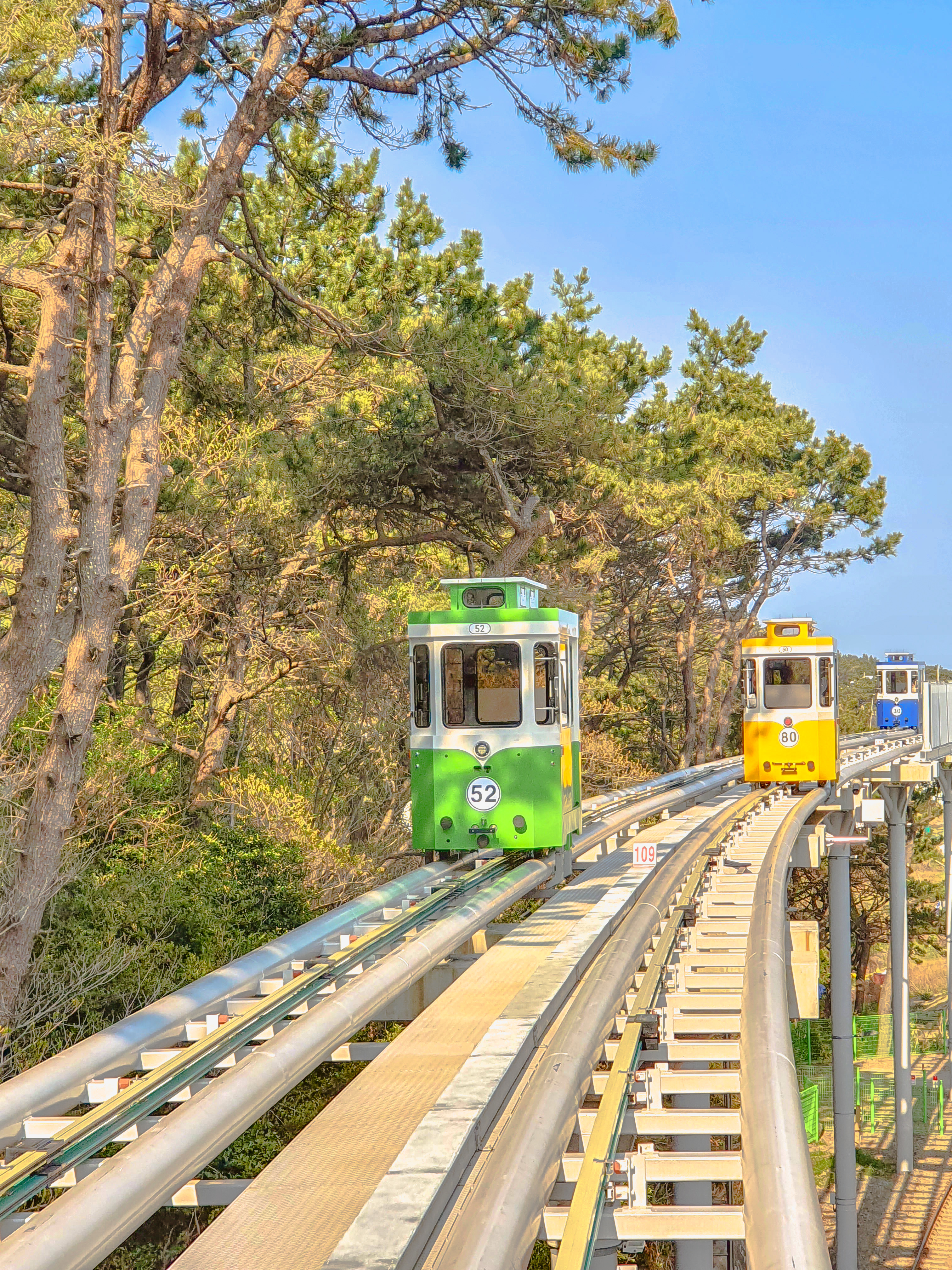 초록, 노랑, 파랑의 카트리지(열차)가 그린 풍경