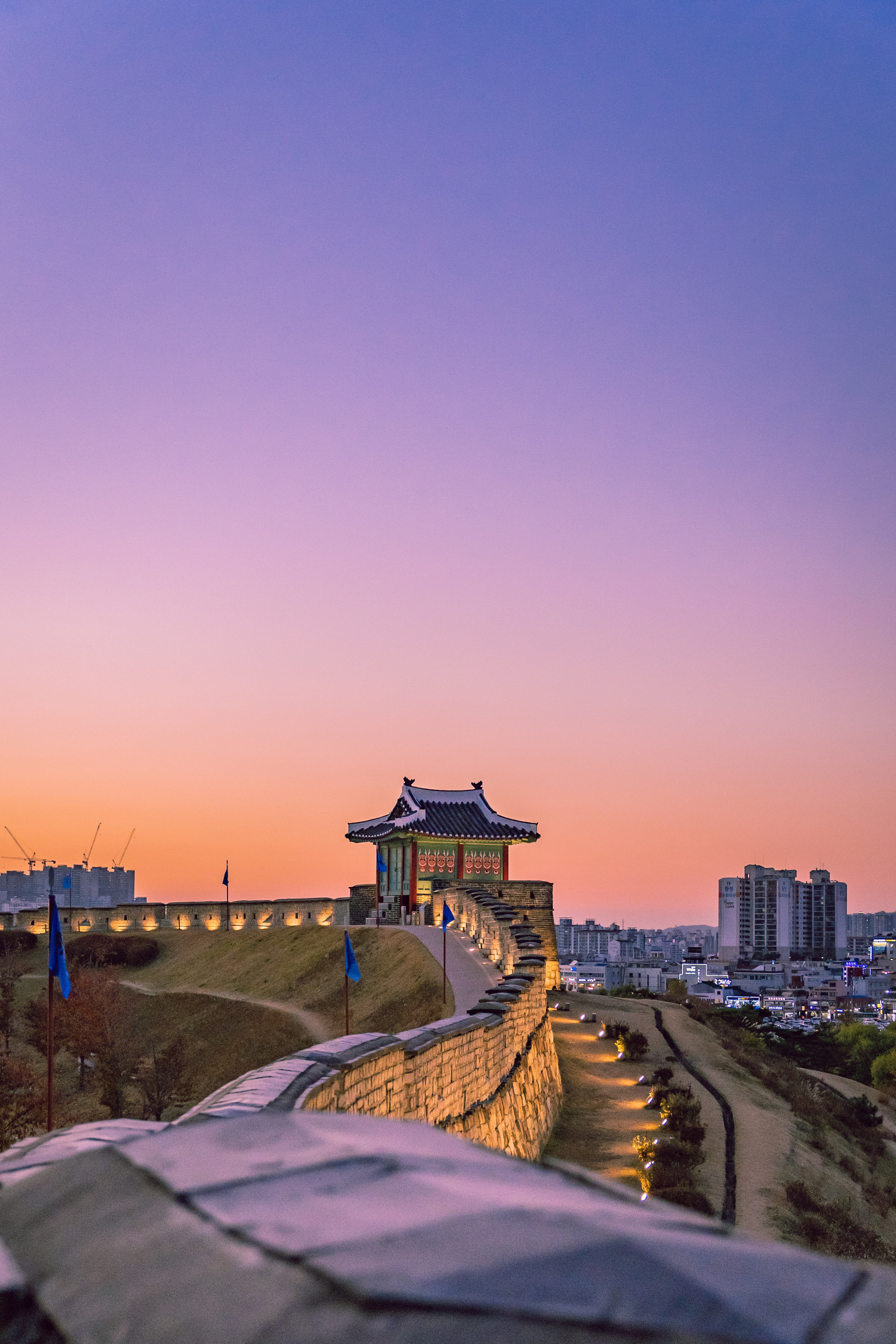 수원화성 성곽 길을 쭉 걷다가 무심코 뒤를 바라보니,아름다운 노을 색과 조명에 빛나는 동북포루를 만날 수 있었습니다. 쭉 이어진 성곽을 따라 시선을 옮겨보니 정말 아름다운 풍경을 보게 되었습니다.