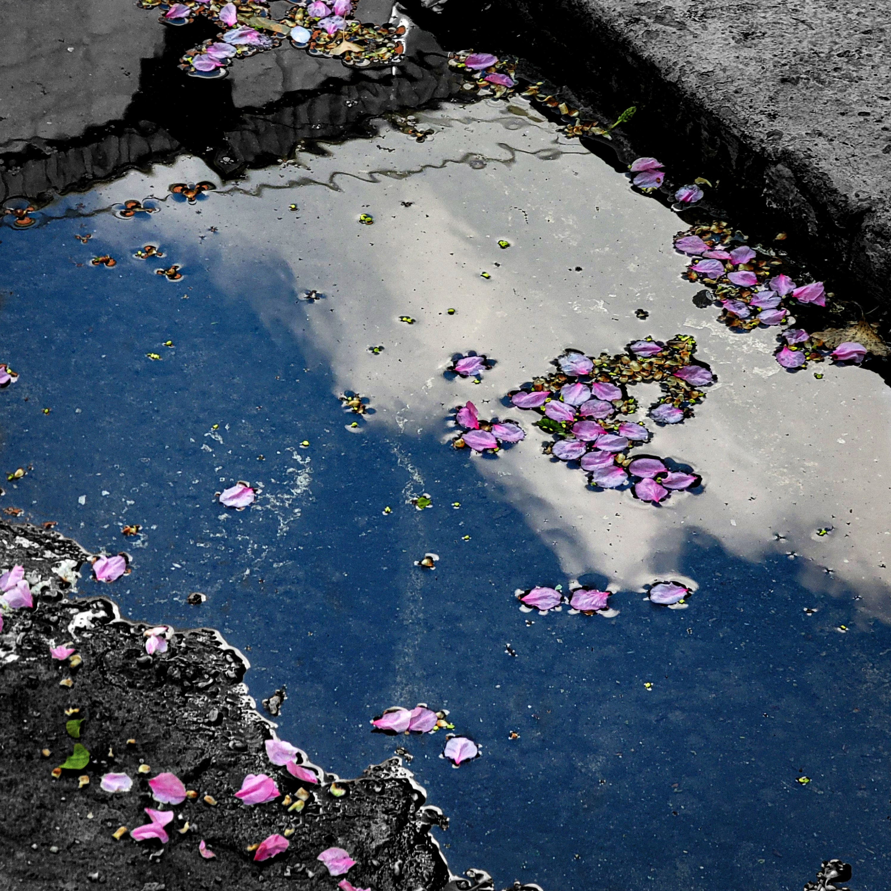 물 웅덩이를 보고있으니 하늘도 보이고 떨어진 벚꽃이 웅덩이에서 하늘을 이불삼아 누워있었습니다.
