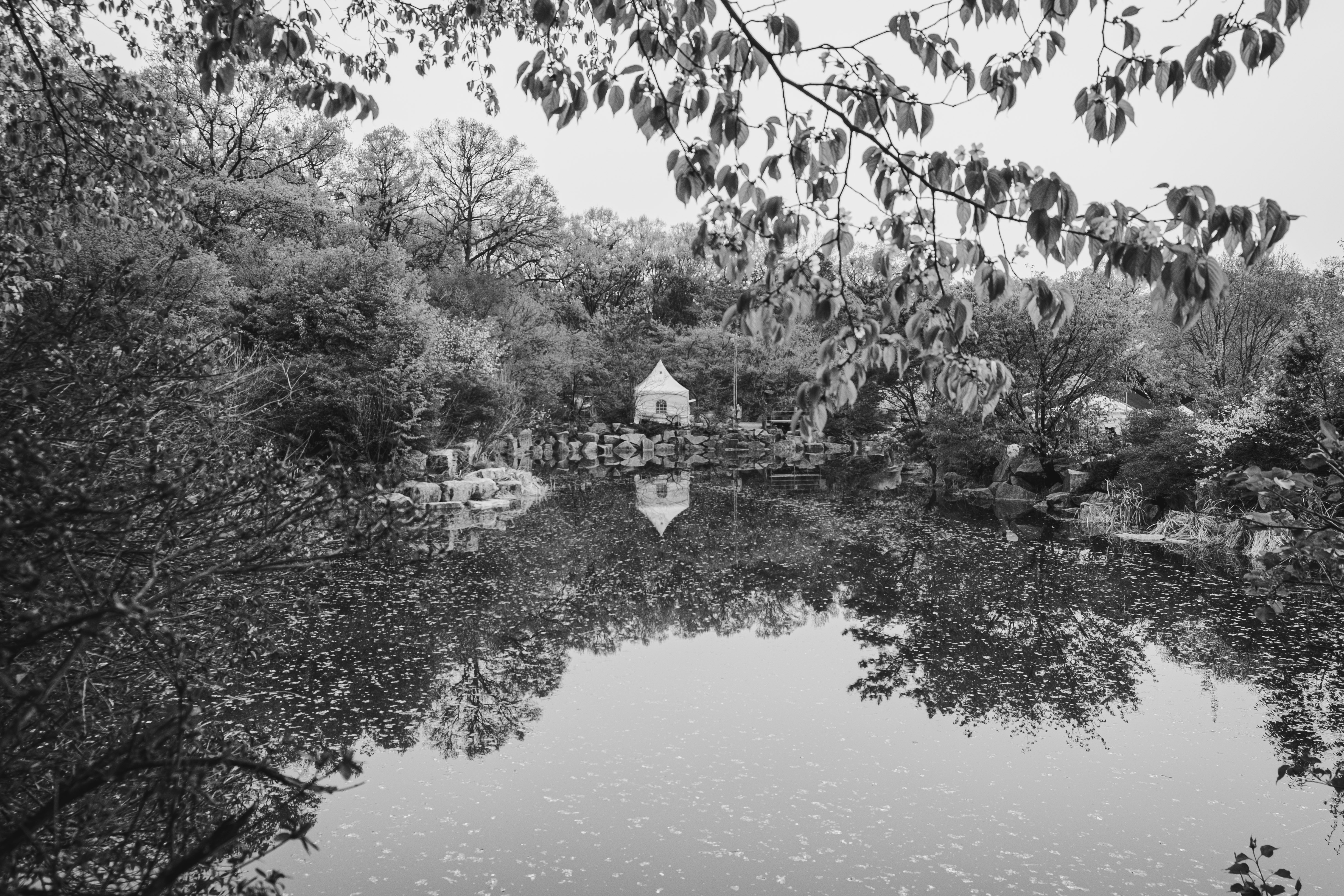 벚꽃이 내려앉은 연못의 풍경