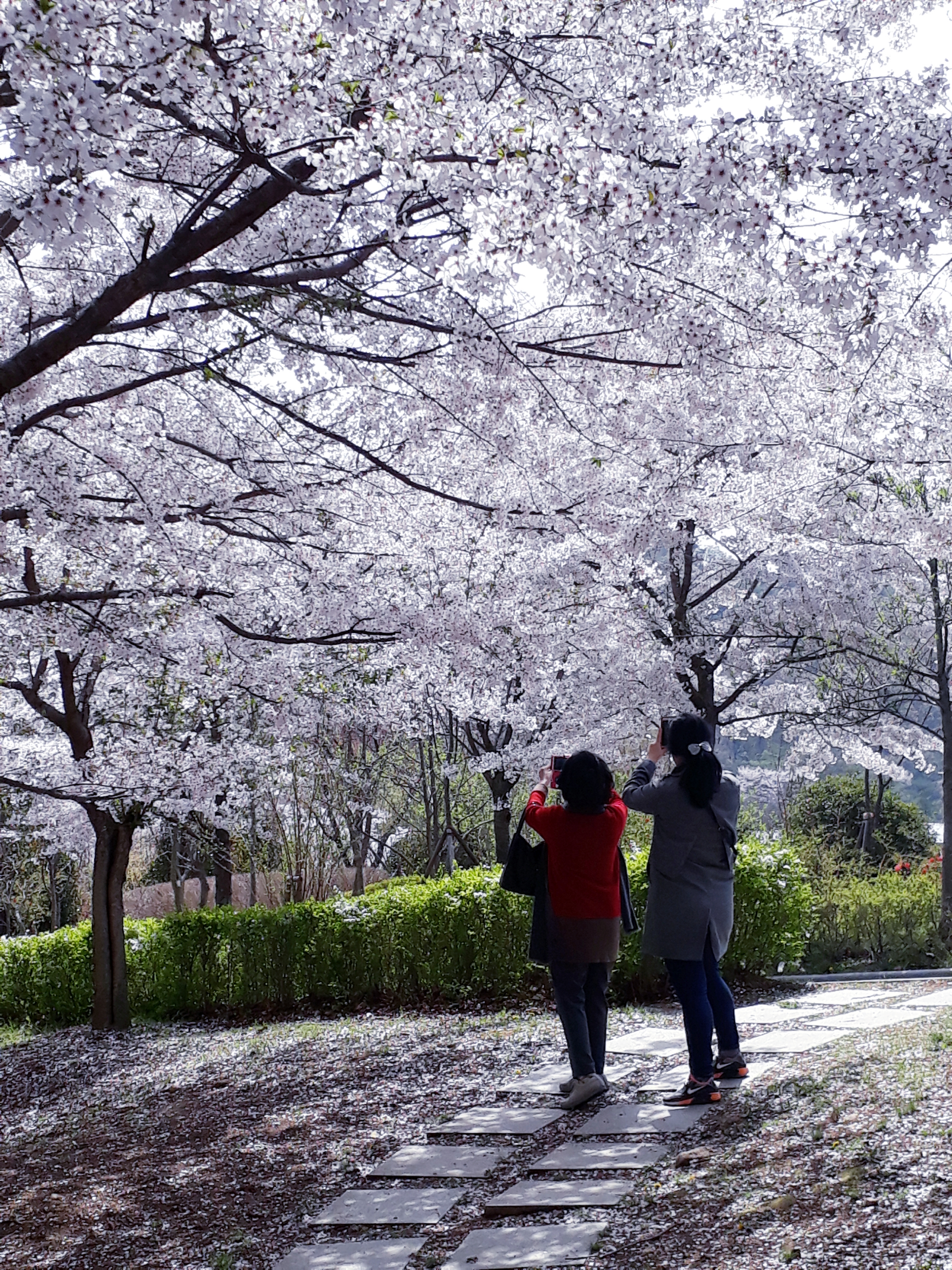 예쁘게 핀 벛꽃 아래에서 사진 찍는 어머니와 아내의 모습