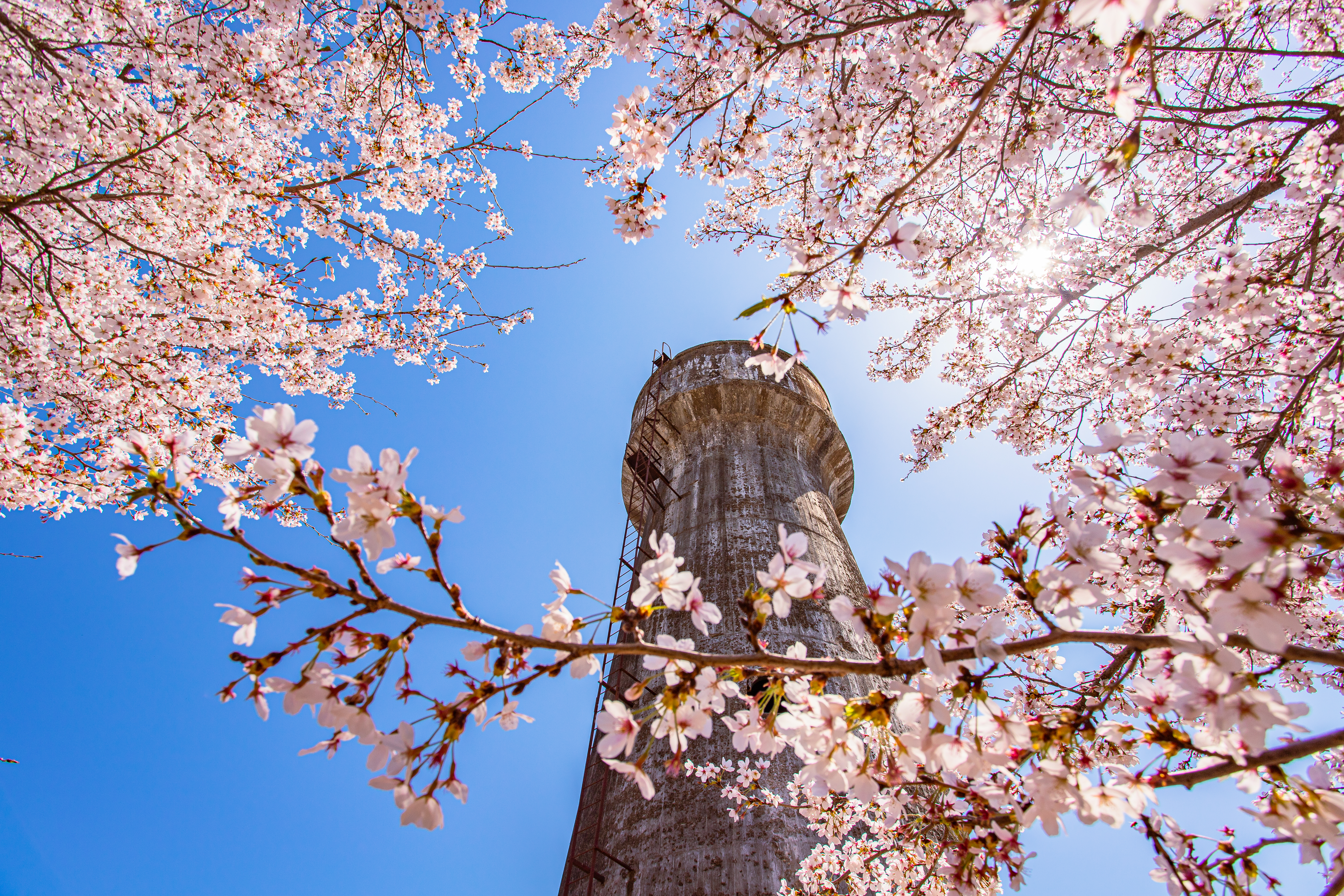 그 중에서도 급수탑과의 벚꽃의 아름다운 조화.