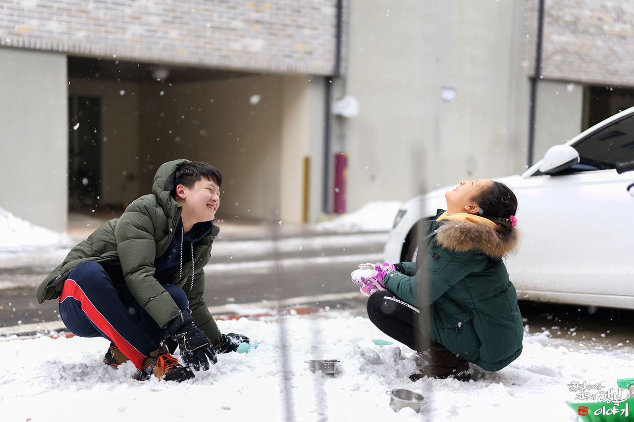 눈오던 날 사이좋게 놀고있는 남매를 촬영한 사진입니다.