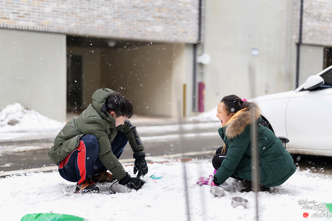 눈오던 날 사이좋게 놀고있는 남매를 촬영한 사진입니다.
