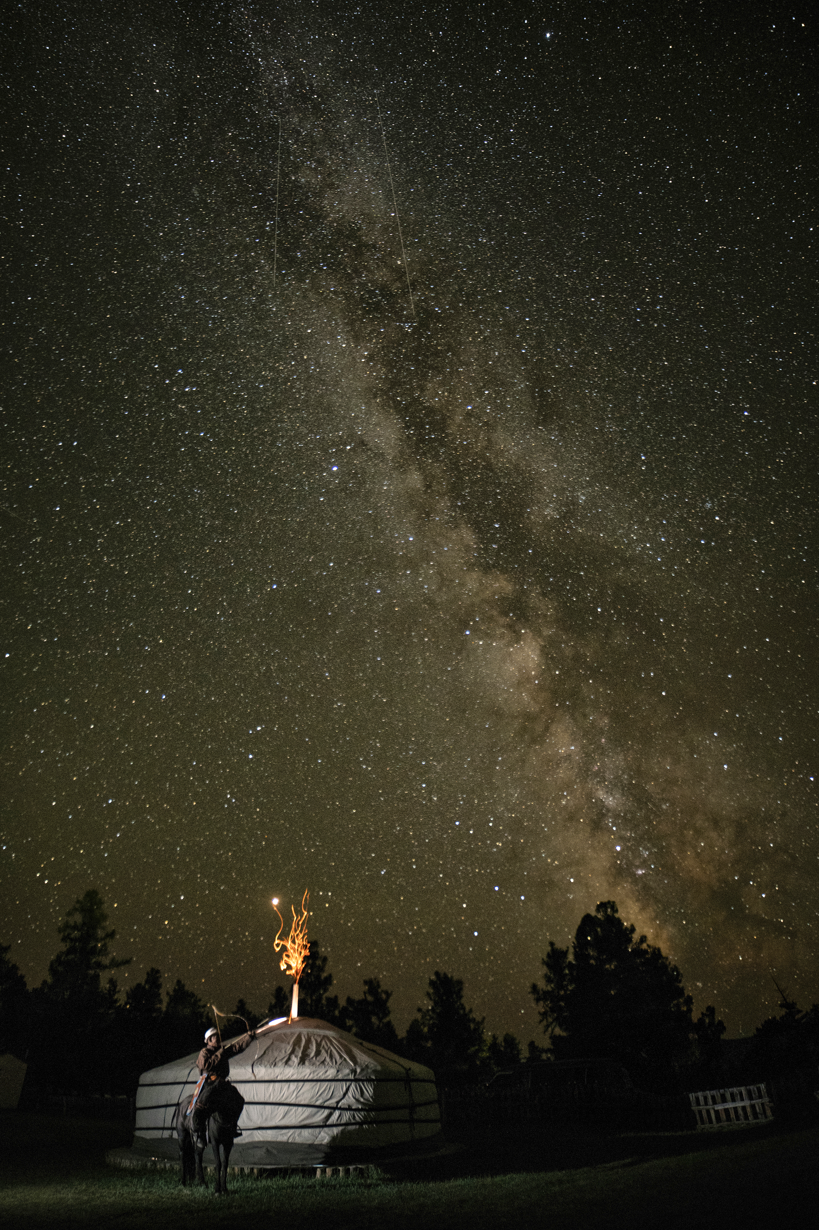 코로나가 없던때 몽골 터싱 칭기르솜에서 은하수 아래 화살처럼 쏟아지는페르세우스 유성우와 별을 쏘는 기수를 담으려 오프플래시 발광 후 25초간 촬영했습니다. 북극권에 가까워 대기광에 옅은 녹색이 감돌고 있습니다.
