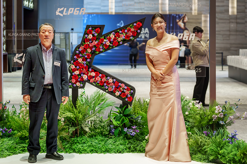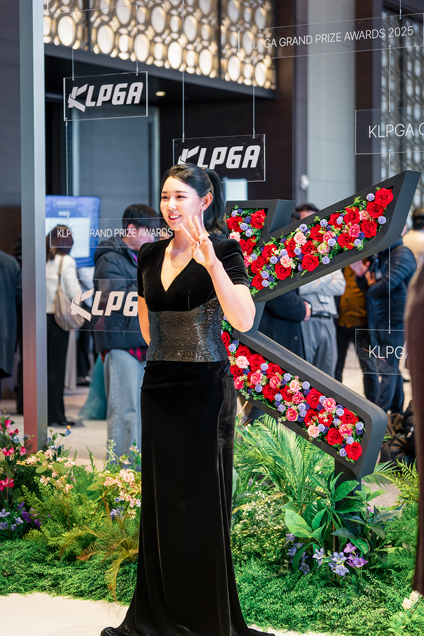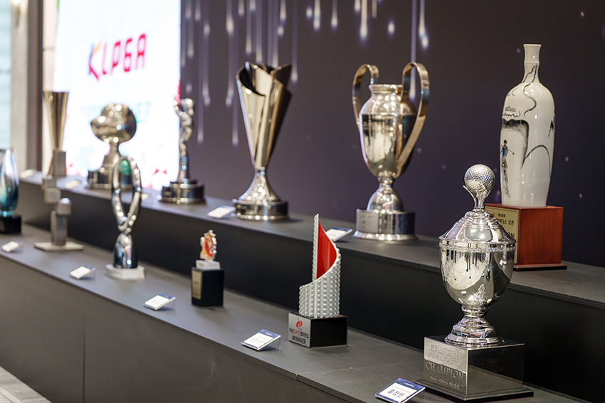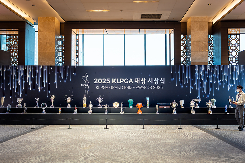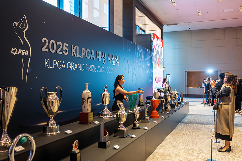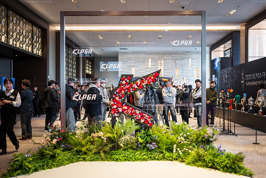 행사장 로비에는 2025 시즌 KLPGA 대회의 우승 트로피들이 전시되어 있었고, KLPGA의 ‘K’를 모티브로 한 플라워 포토존이