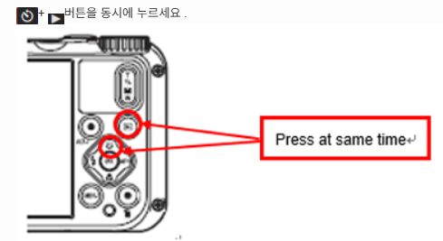 4) 펌웨어 파일이 저장된 SD 카드를 카메라에 삽입한 후, 카메라의 ‘위’ 방향키와 ‘재생’ 버튼을 동시에 1초 이상 눌러주세요.