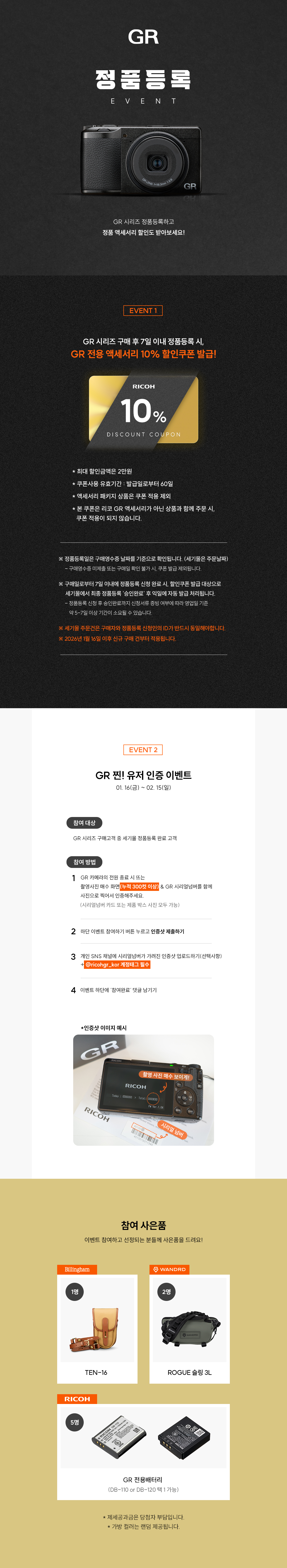 2. 본 이벤트는 리코 GR 시리즈 전 기종 대상으로 진행되며, 1월 16일 이후 주문건부터 적용됩니다.