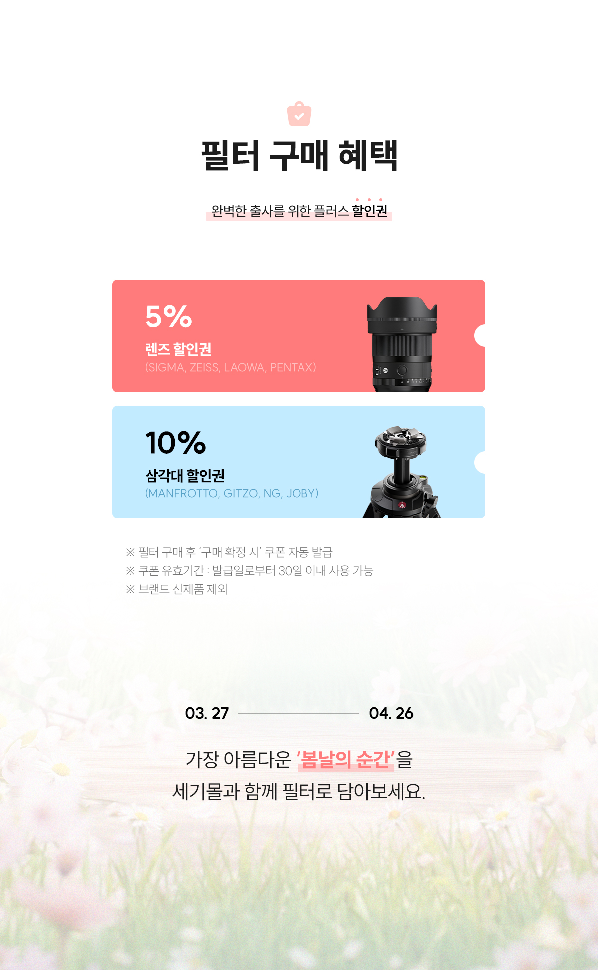 1. 본 기획전 필터는 한정 수량으로 진행됩니다.2. 본 기획전 할인율은 해당 기간 내에만 적용 가능하며, 어떠한 경우에도 동일한 혜택으로 제공되지 않습니다. 3. 본 기획전에 제공되는 할인 쿠폰은 ‘구매 확정 시’ 자동 발급되며, 발급일로부터 30일 이내 사용 가능합니다.4. 이벤트 문의는 세기몰 1:1 문의 및 고객 센터(02-3668-3114)로 문의해 주시길 바랍니다.