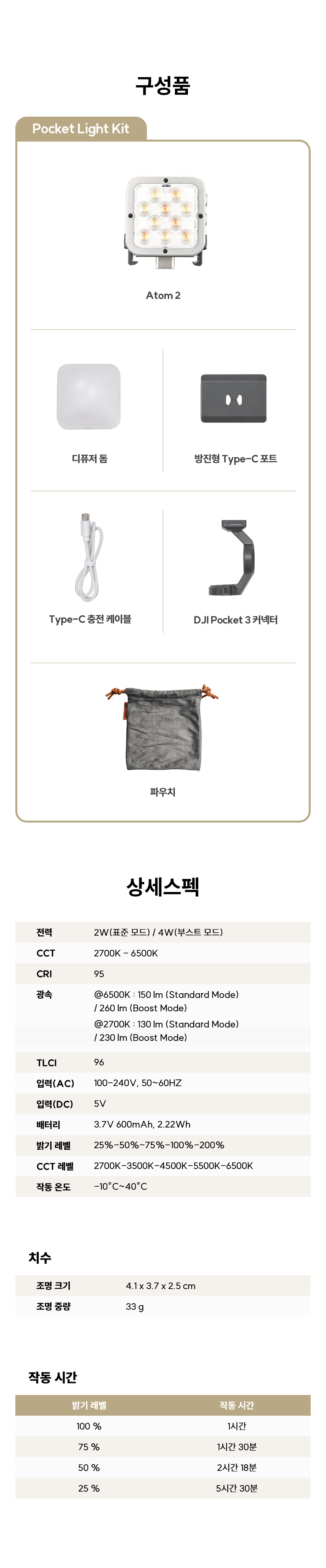 할로우(Harlowe)에서 포켓3와 액션캠을 위한 초소형 LED 조명을 선보였습니다. 다양한 마운트를 지원해서 다용도로 사용할 수 있는 혁신적인 제품이라 소개해 드립니다! 패키지가 검정 박스에 고급스럽습니다. 왼쪽은 아톰2 포켓 라이트 키트, 오른쪽은 아톰2 유니버셜 크리에이터 키트입니다. 아톰2 본체와 디퓨저, 파우치, 케이블의 구성품은 동일하고 각각 포켓 마운트와 액션캠, 콜드 슈 마운트 구성이 다릅니다. 아톰 2 포켓 라이트 키트의 구성입니다. 아톰 2, 디퓨저 돔, 방진형 C타입 포트, C to C 케이블, 포켓3 커넥터, 파우치, 설명서가 들어있습니다. Harlowe Atom 2 본체 아톰 2 본체부터 살펴보겠습니다. 앞쪽에는 색온도 조절이 가능한 바이칼라 LED와 주변에 디퓨저를 위한 4개의 자석이 있습니다. LED 앞에는 프레넬 렌즈가 있어서 빛의 확산을 도우며 2W 조명으로 부스트 모드 사용 시 4W 밝기까지 올라갑니다. 뒤쪽에는 할로우 로고와 앞과 마찬가지로 4개의